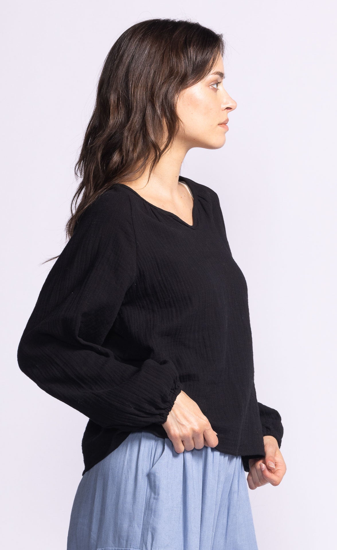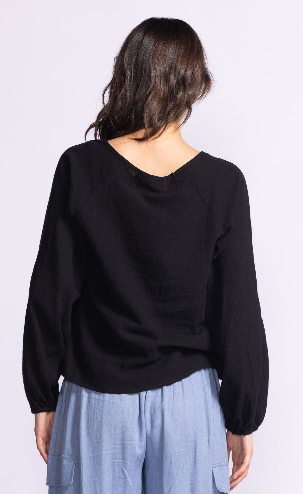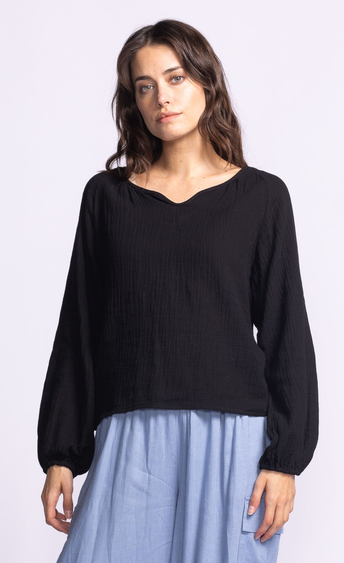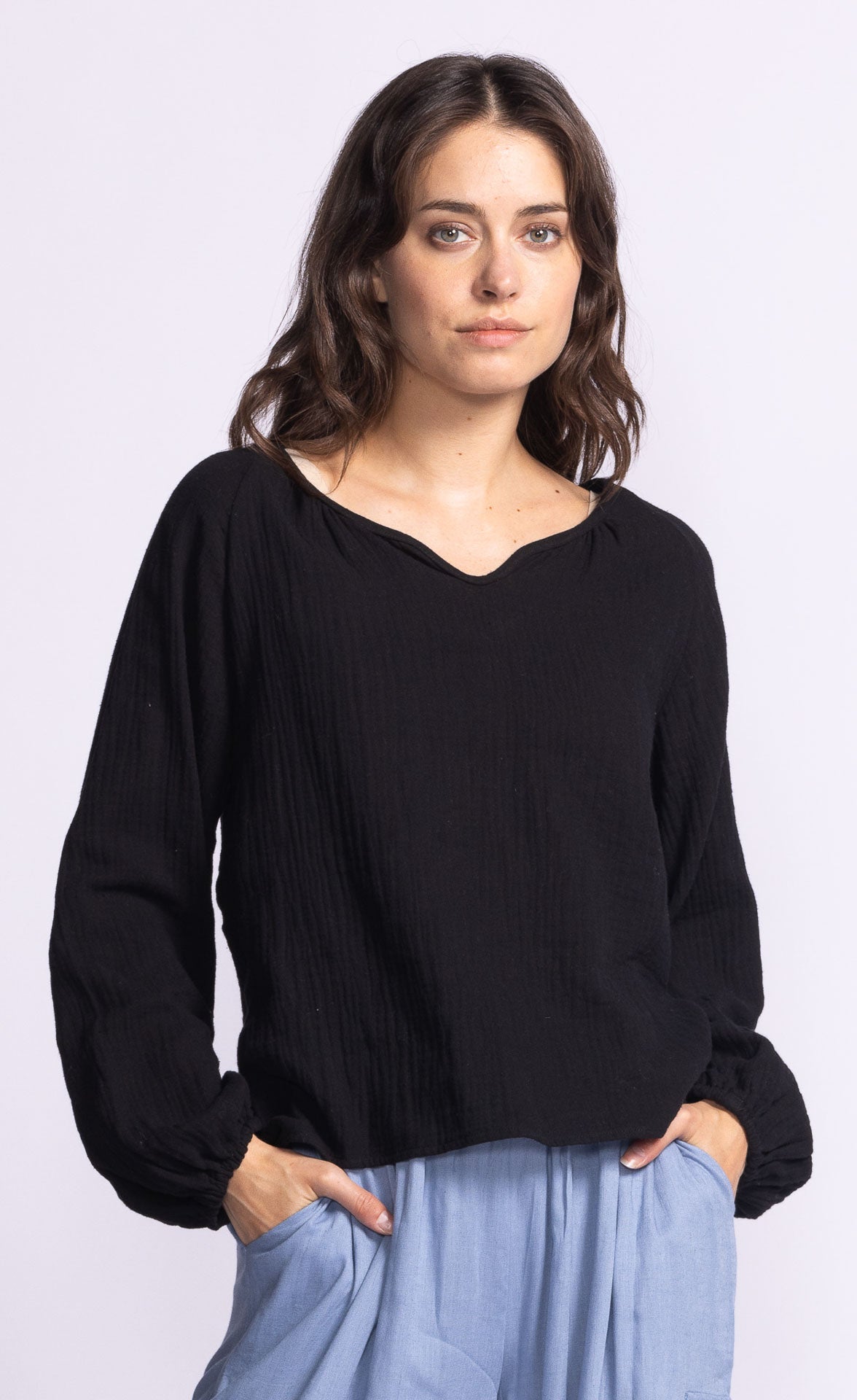 The Alexa Top features airy bishop sleeves with elastic cuffs, a relaxed fit, and a breezy linen blend. Perfect for travel, it pairs effortlessly with anything in your wardrobe.