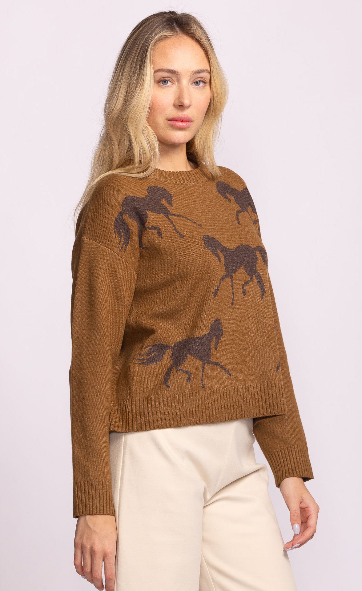 The Meadow Sweater is a cozy knit pullover featuring jacquard horse silhouettes for a touch of rustic charm. Finished with rib-knit trims and a relaxed fit, it's the perfect everyday sweater to pair with jeans or a skirt for a comfy-cute look you'll wear on repeat.