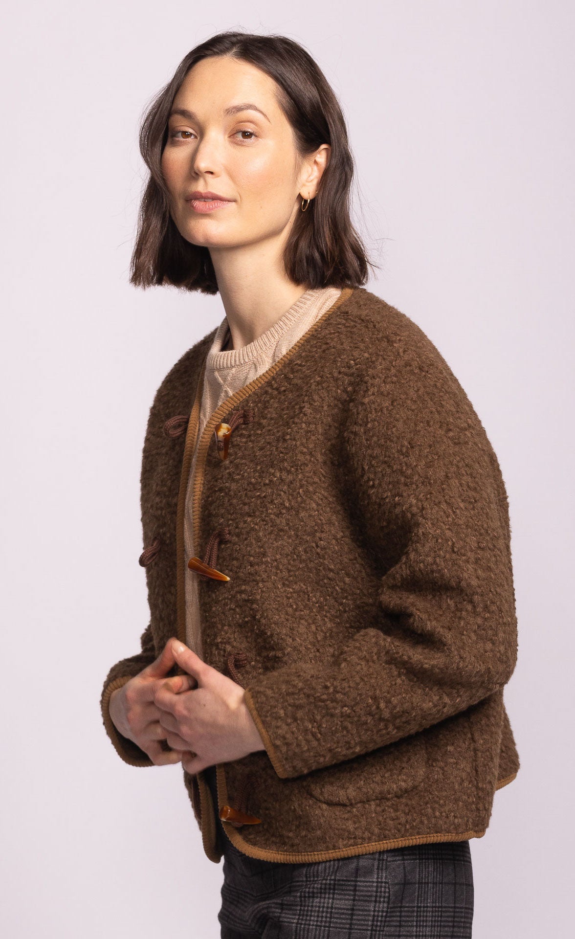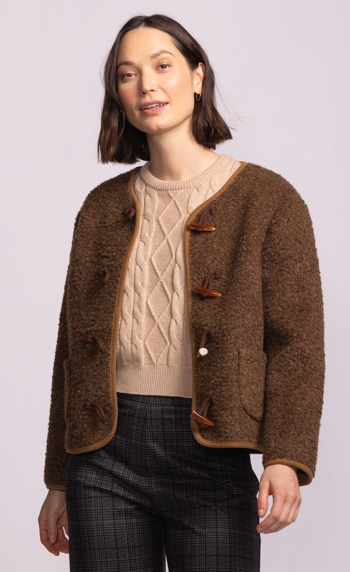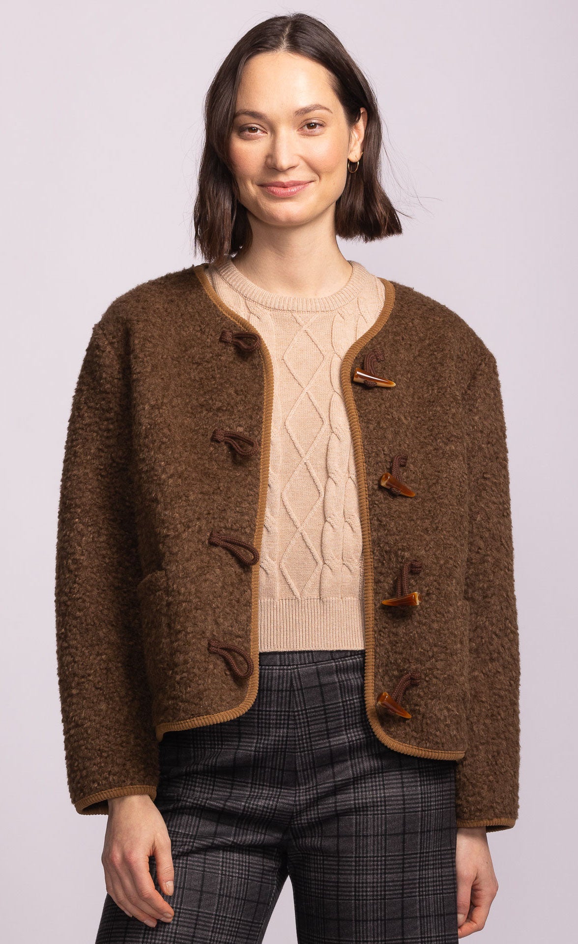 The Lomas Jacket is a fleece jacket designed with horn-toggle detailing for that rustic charm. This cool-weather staple adds instant polish to any outfit while keeping you cozy. Style it with a mock-neck top, jeans and a pair of knee-high boots for a chic, sophisticated look!