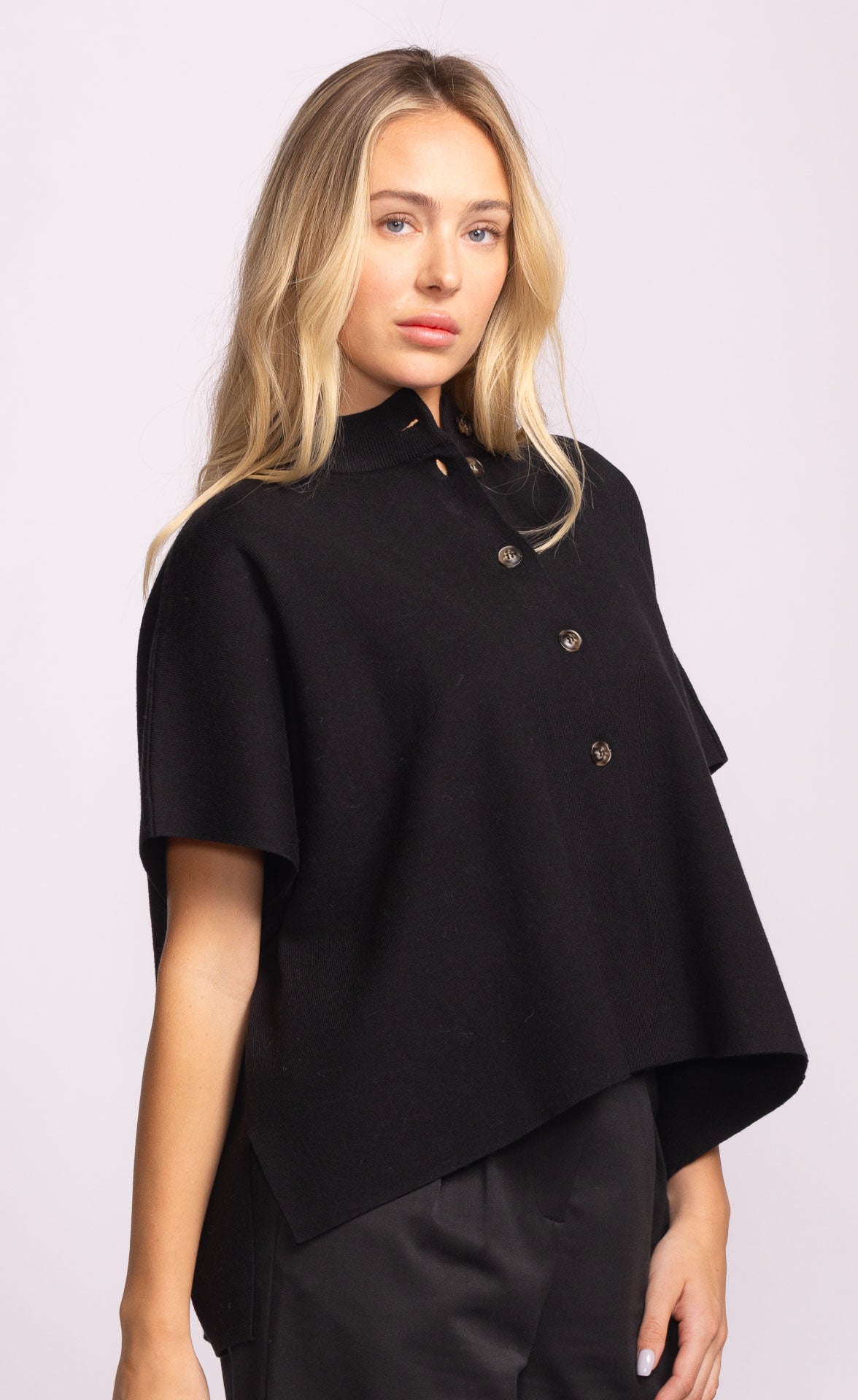 The Melrose Sweater is a mock neck button-up knit sweater designed with a seamless, boxy silhouette that drapes effortlessly. Finished with extended sleeves and a clean front closure, it's the perfect piece to style with tailored pants for a polished in-office look or jeans for casual elegance.