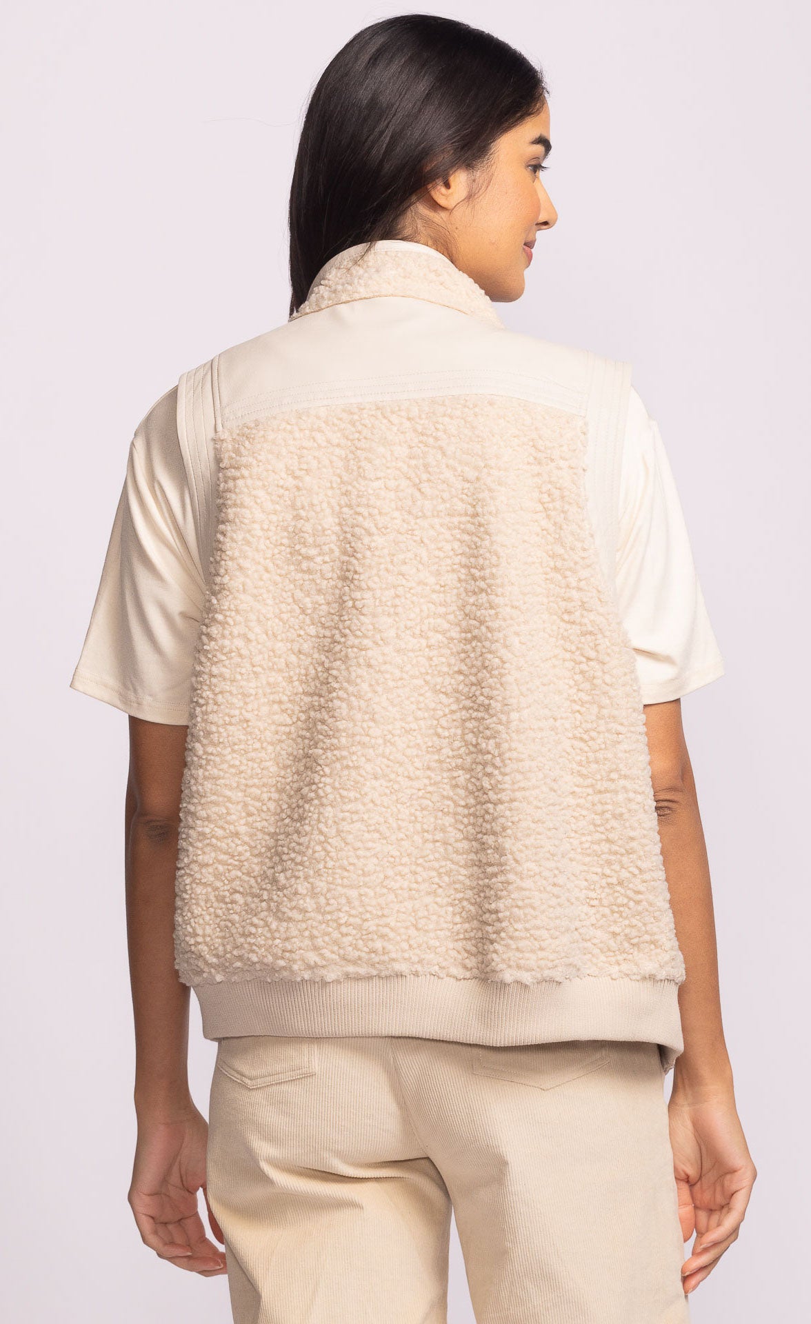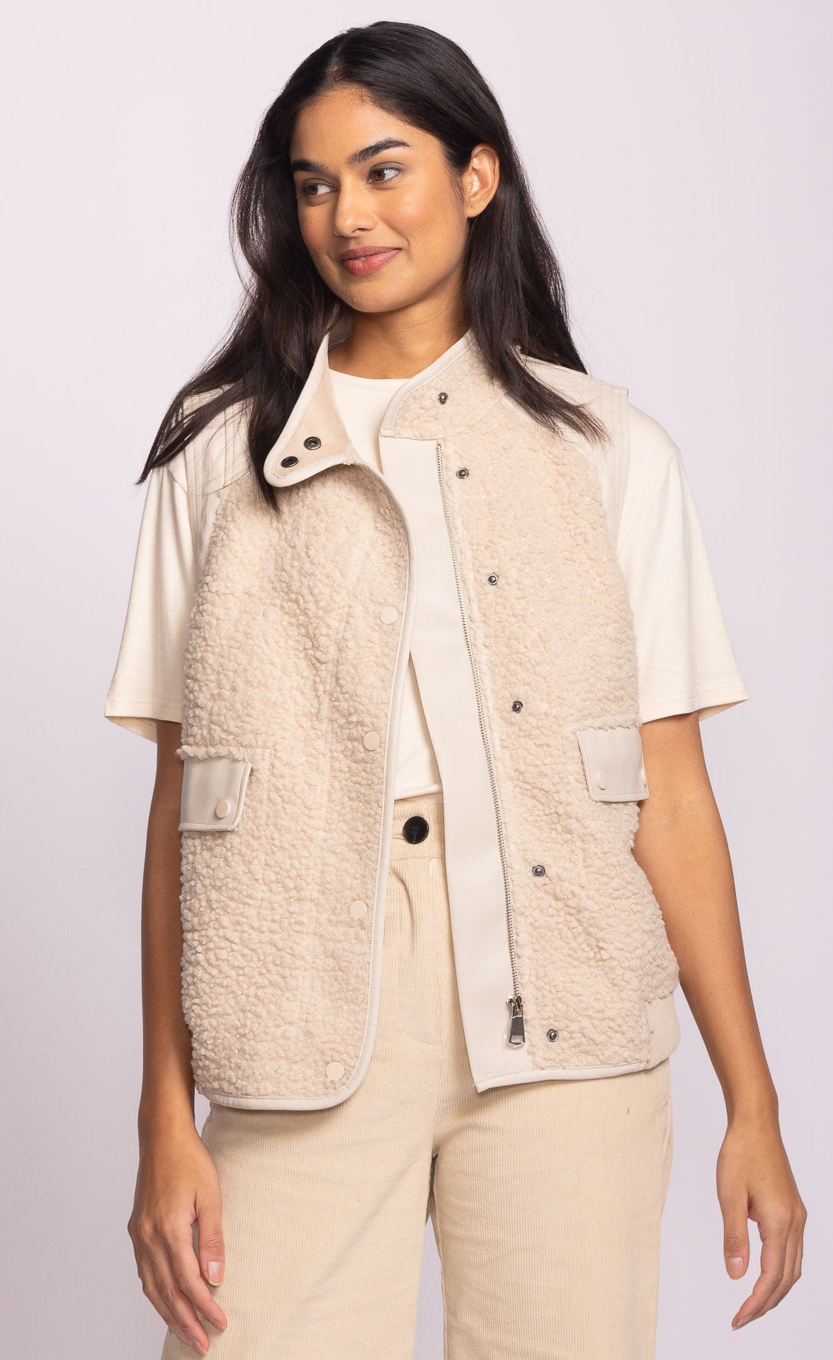 The Vincino Vest is a fleece vest accented with leather trims and tonal hardware, designed for the perfect balance of edge and comfort. Ideal for layering during chilly weather transitions, pair it over a fitted long-sleeve top and jeans for a casual look or over a dress for a stylish night out.