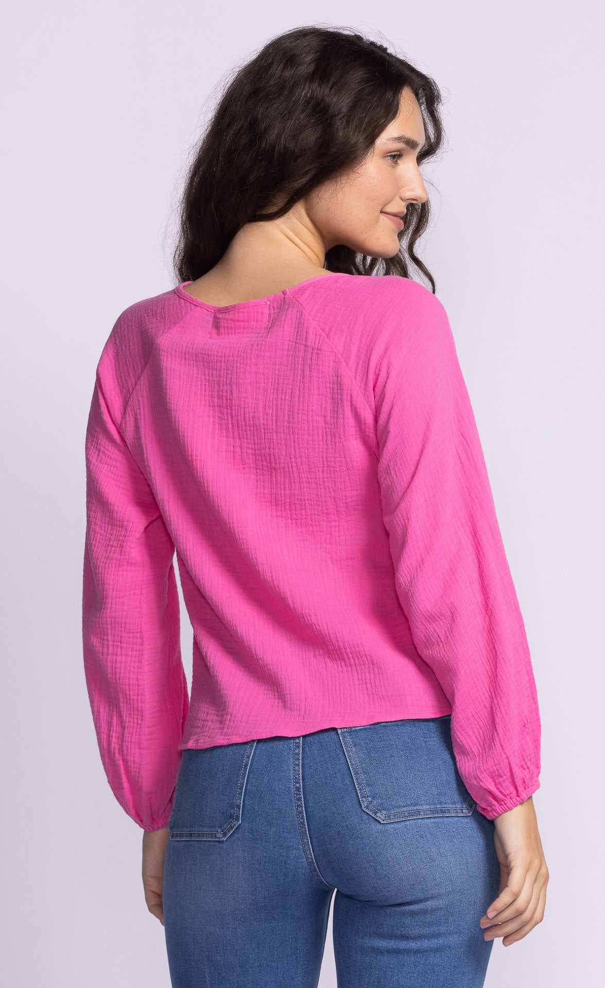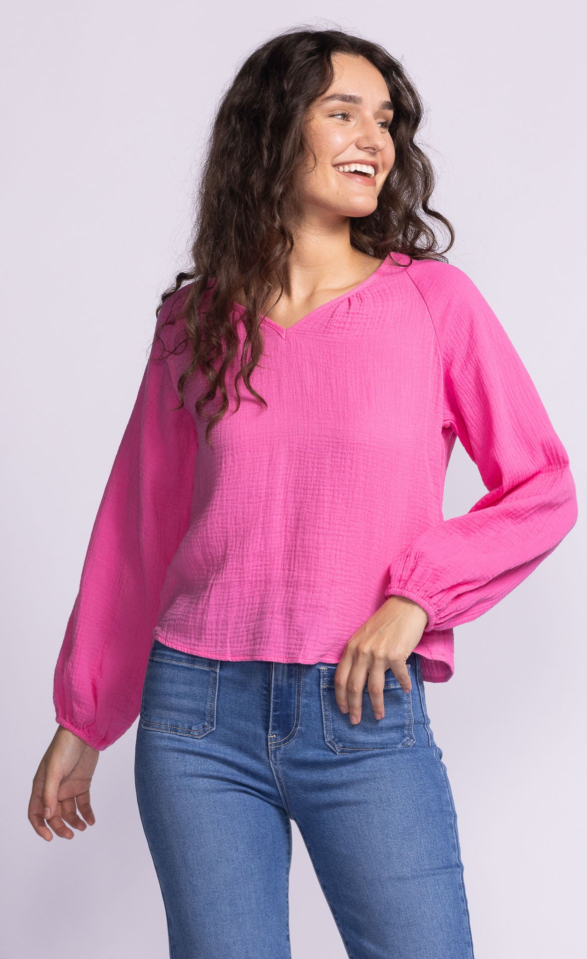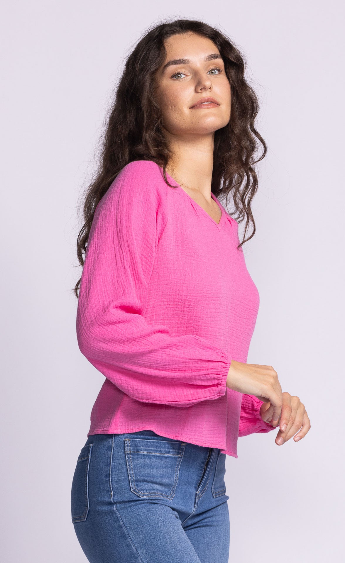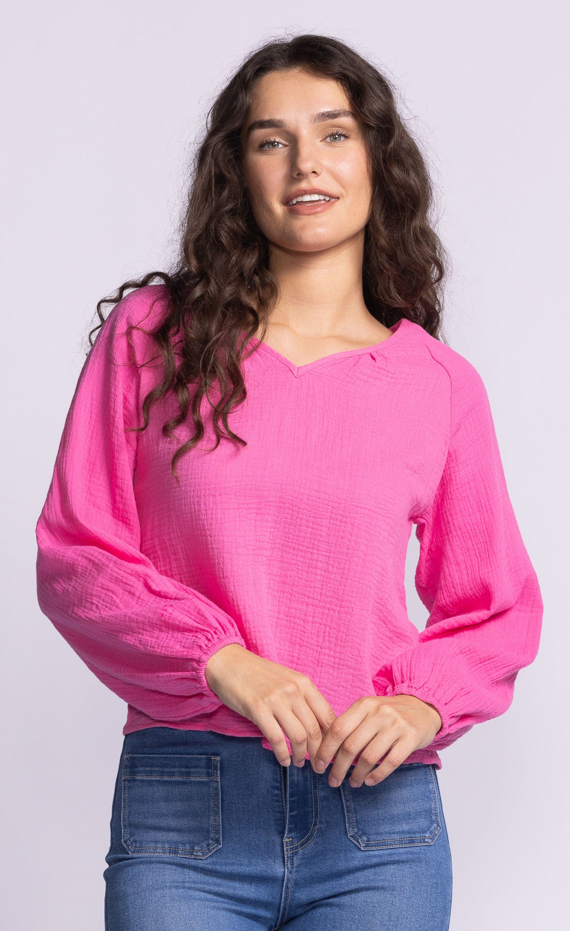 The Alexa Top features airy bishop sleeves with elastic cuffs, a relaxed fit, and a breezy linen blend. Perfect for travel, it pairs effortlessly with anything in your wardrobe.
