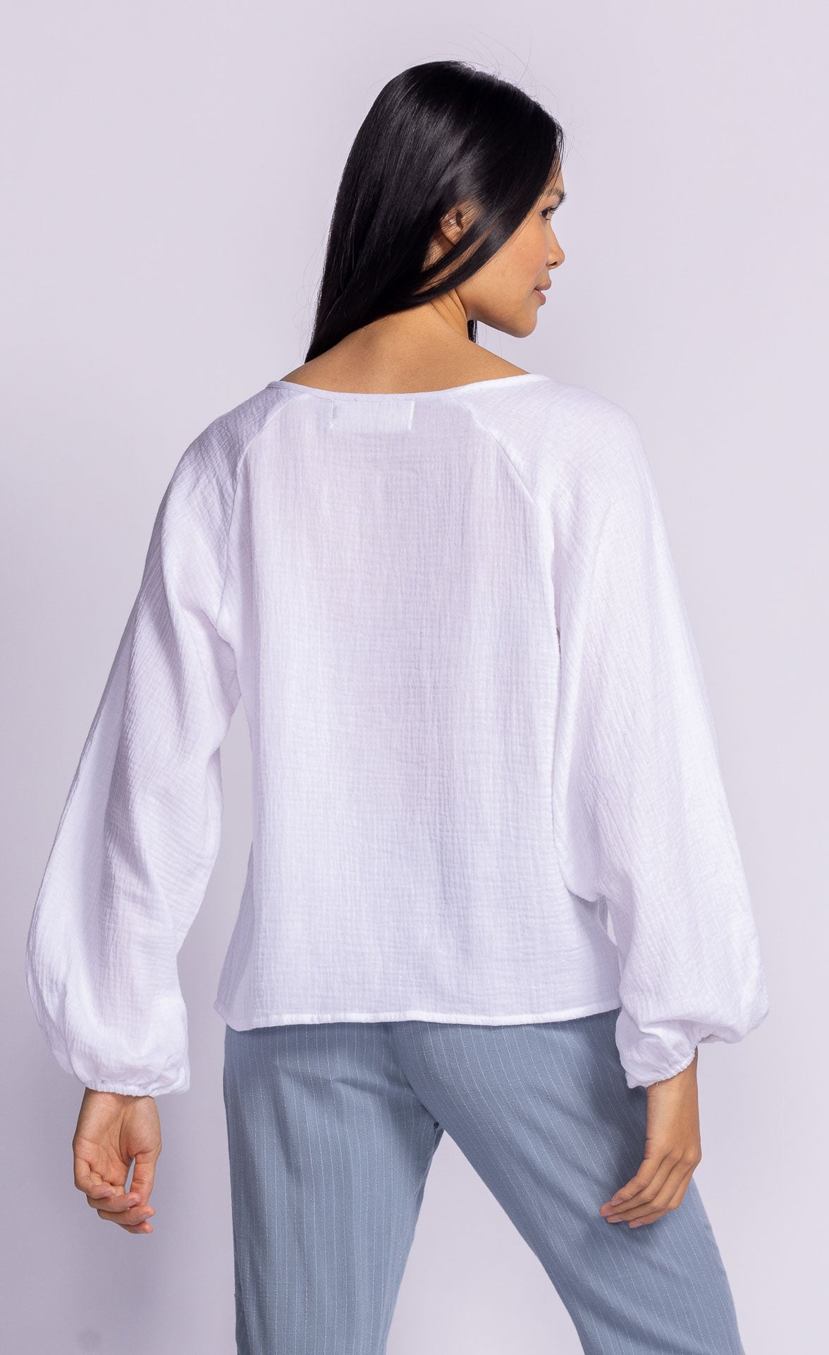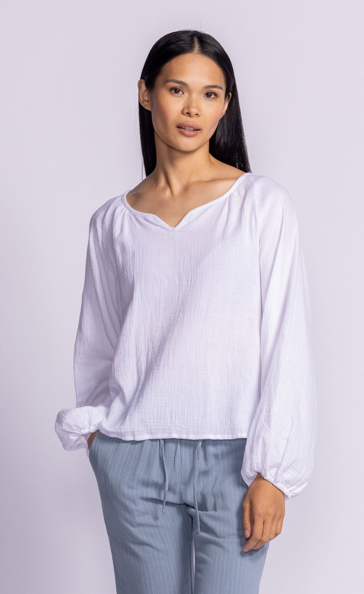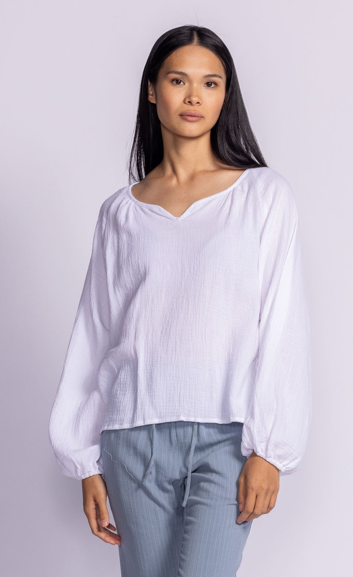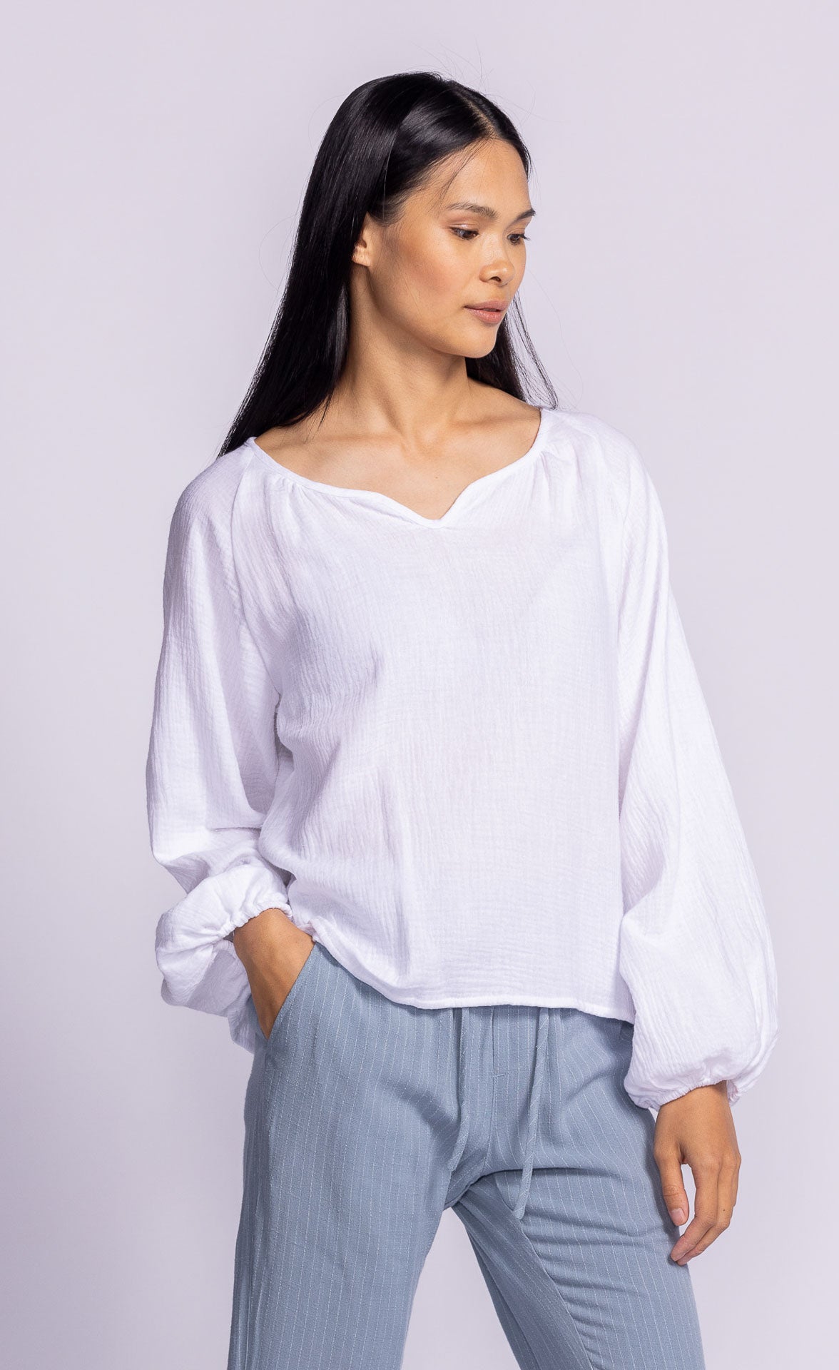 The Alexa Top features airy bishop sleeves with elastic cuffs, a relaxed fit, and a breezy linen blend. Perfect for travel, it pairs effortlessly with anything in your wardrobe.