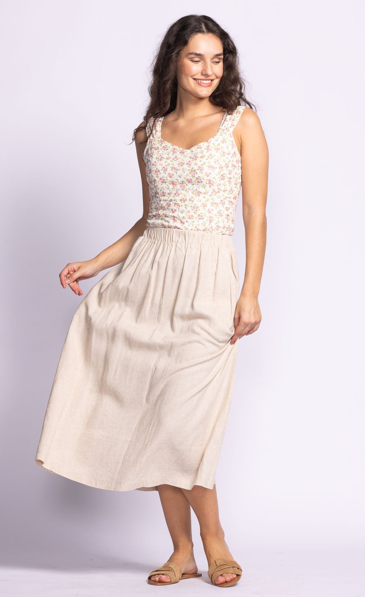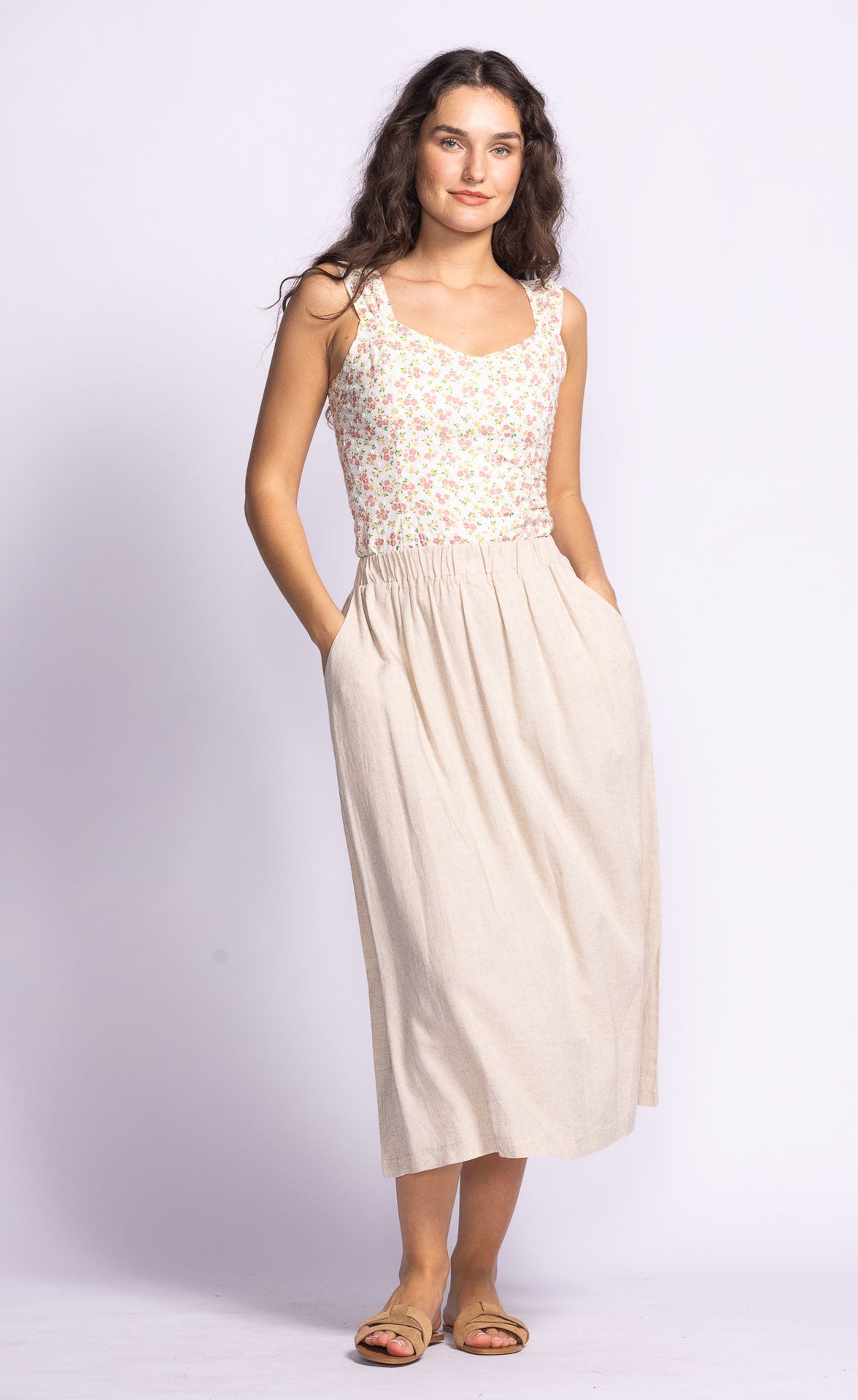 The Carter Skirt is a breezy, flowy staple with an elastic waistband and side pockets—perfect for spring and summer, just pair it with a tank and sandals!