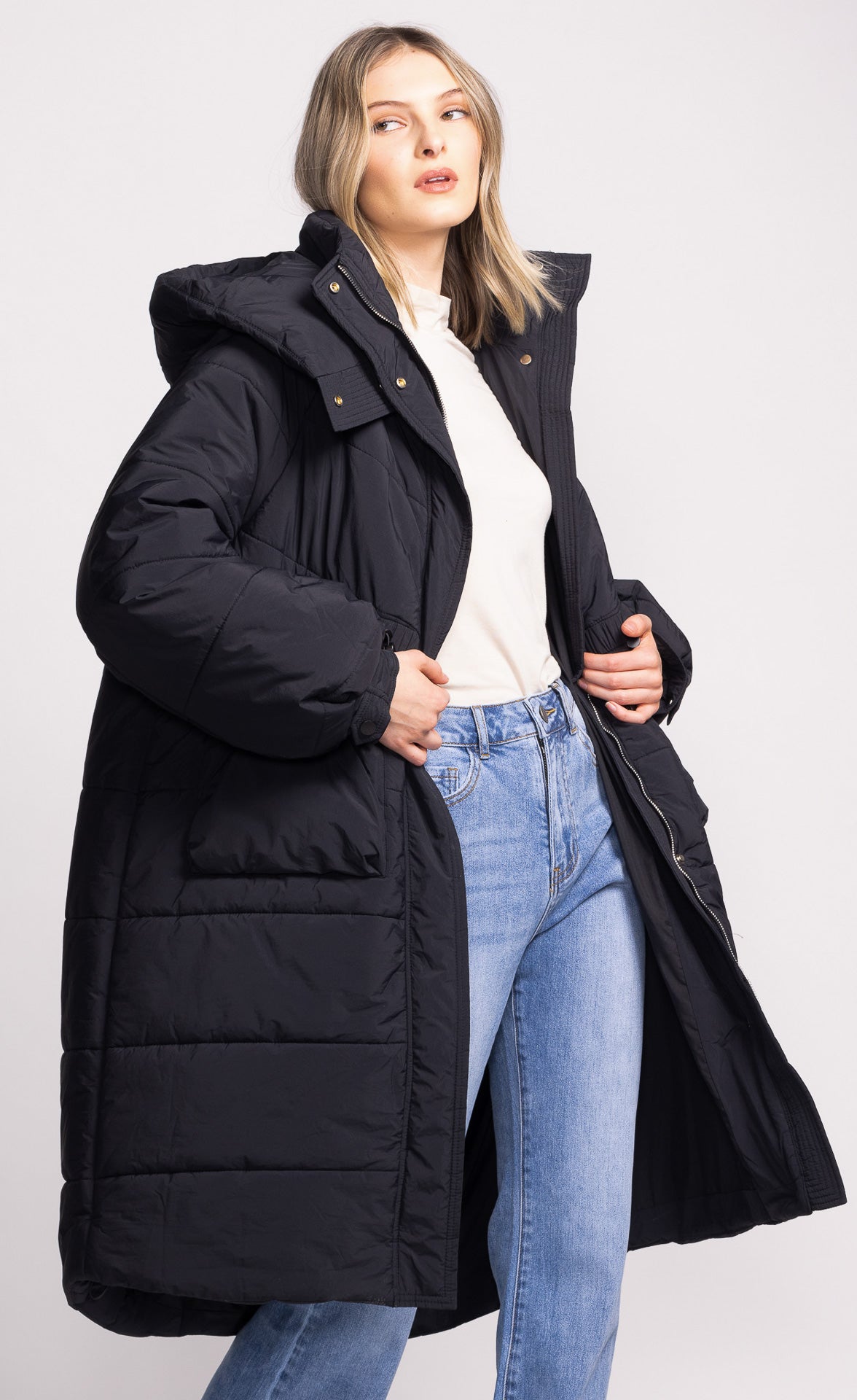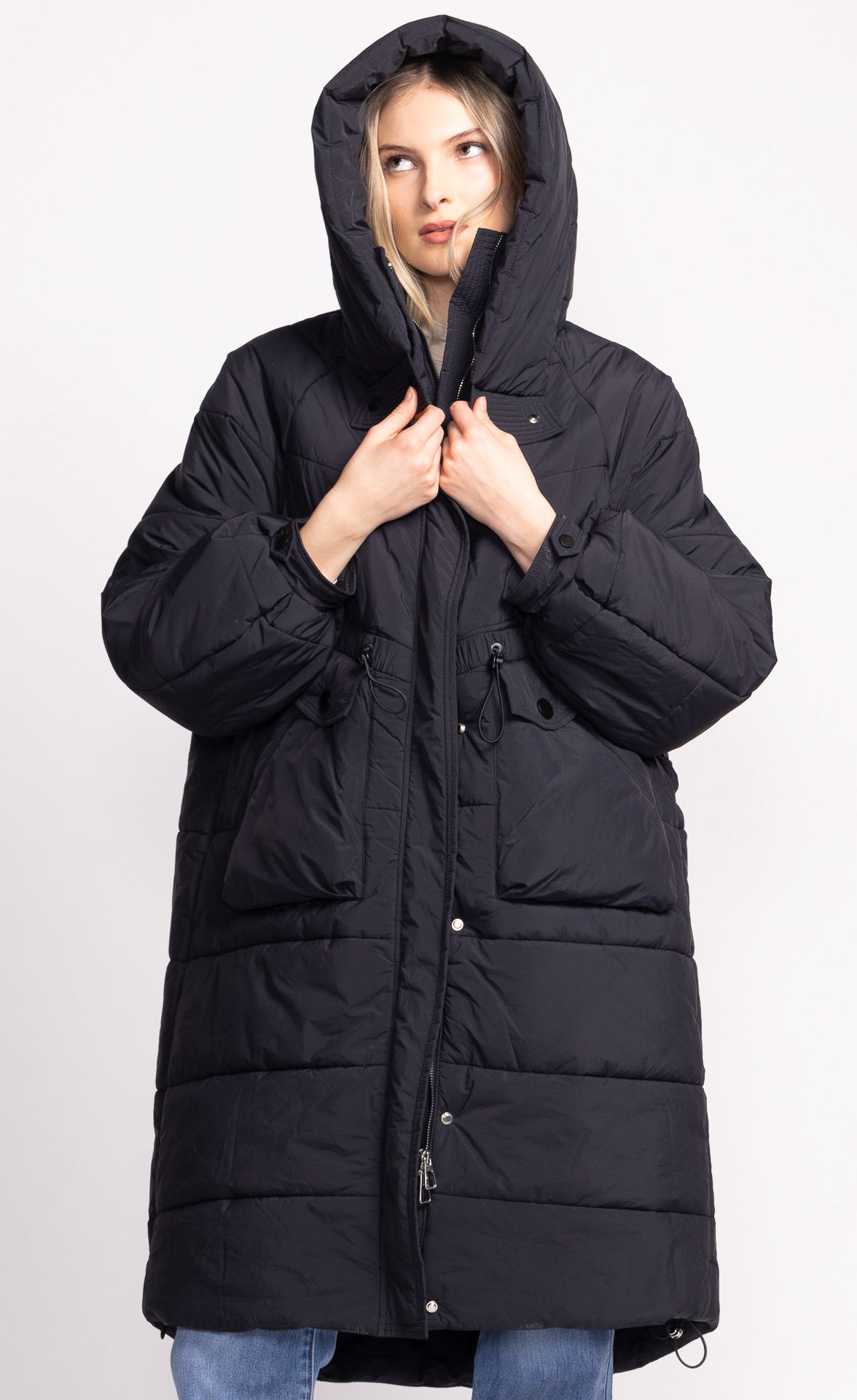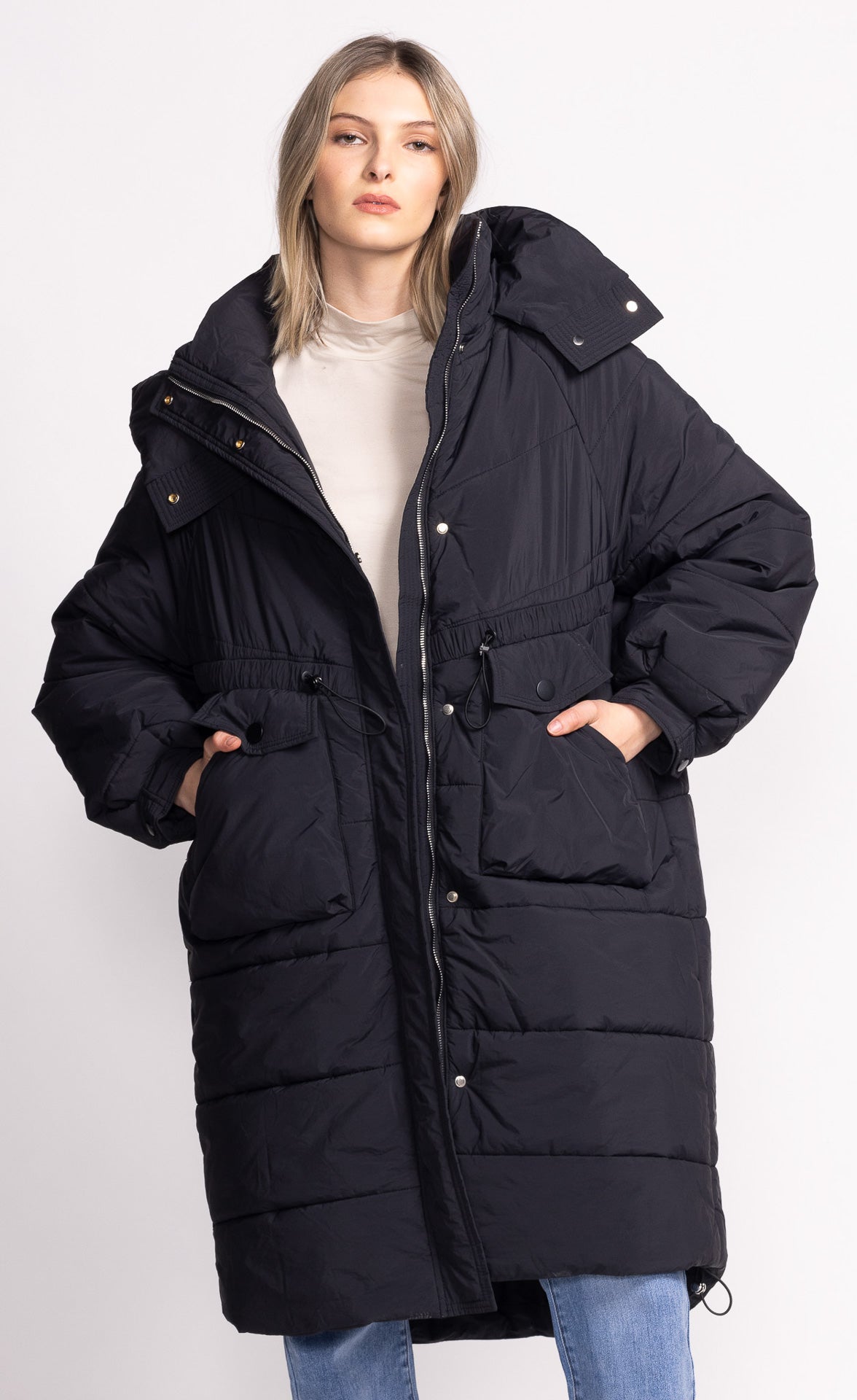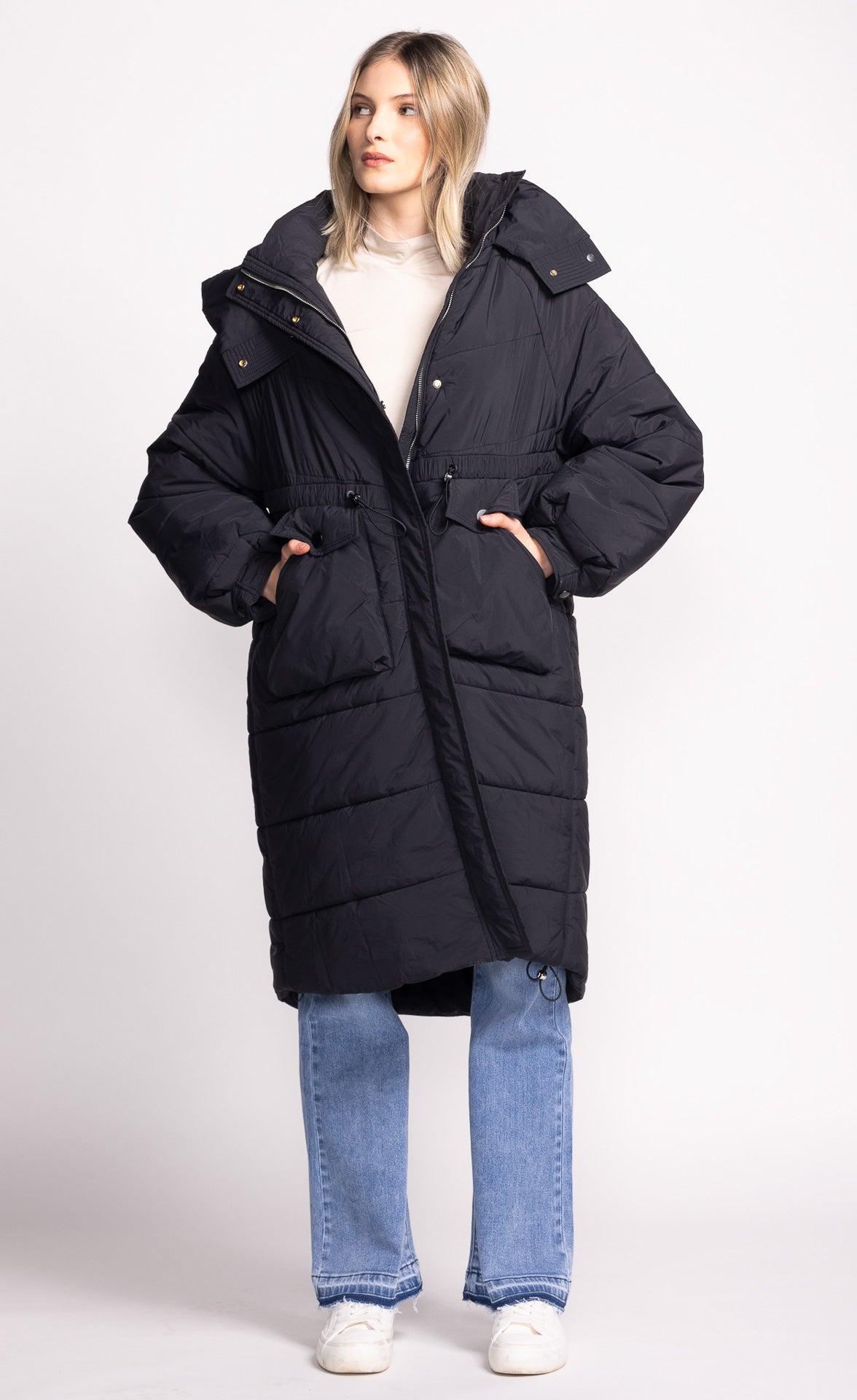 The Tanya Jacket is the ultimate puffer, perfect for keeping cozy in chilly weather. This long, hooded jacket features a drawstring waist and hem for a custom fit, offering both style and warmth in a laid-back, effortlessly cool look.