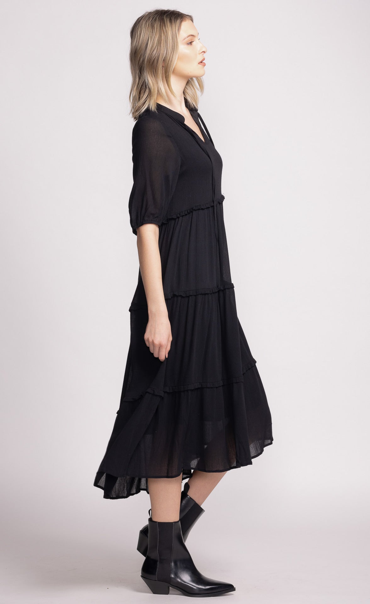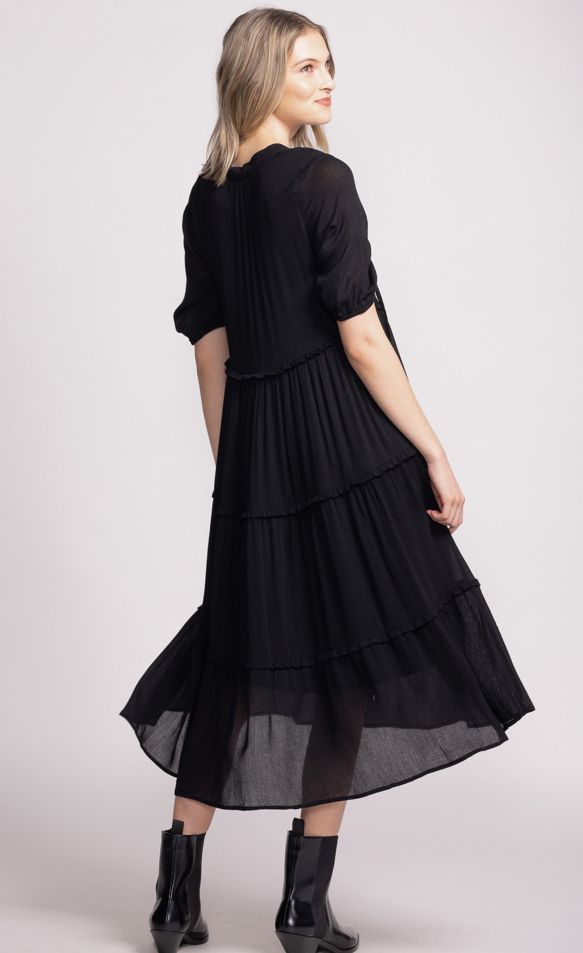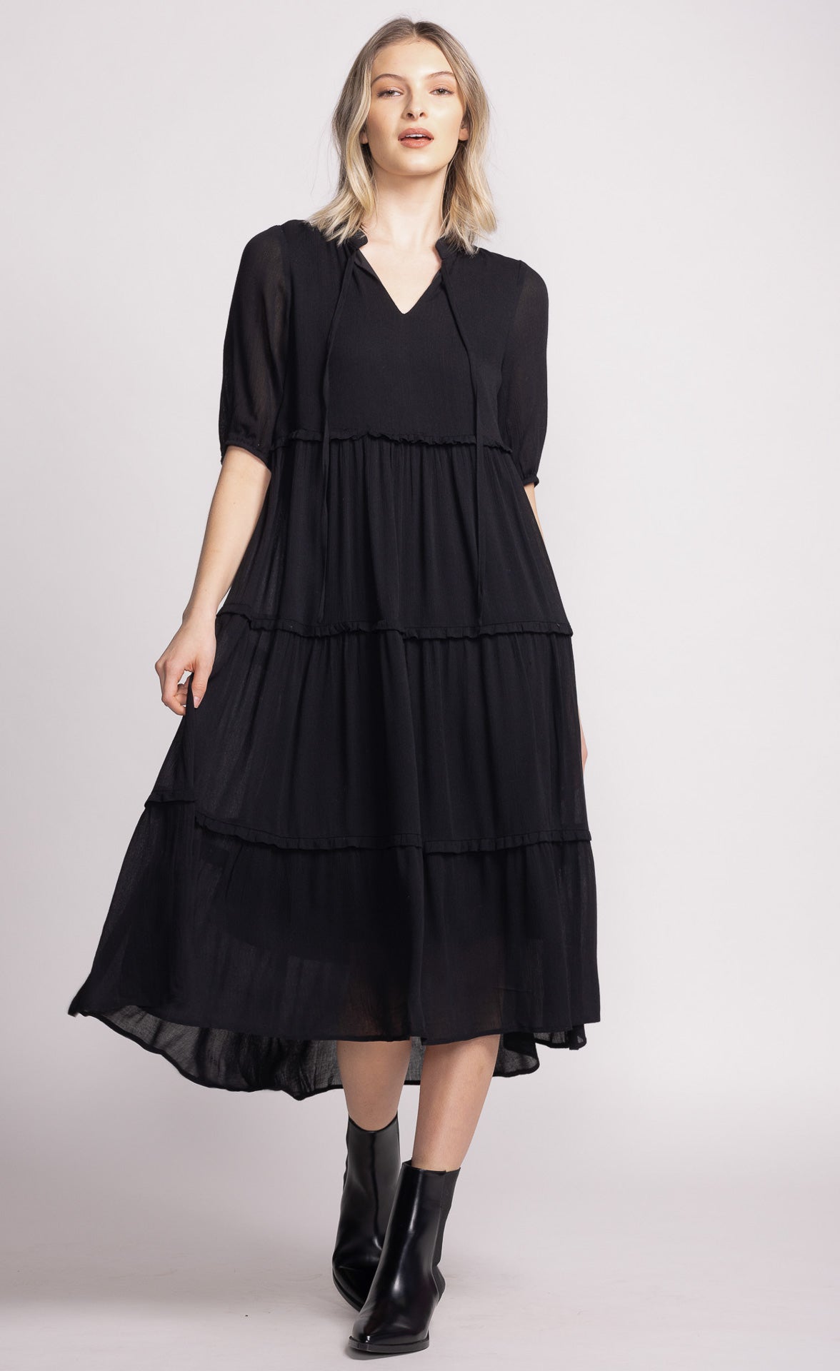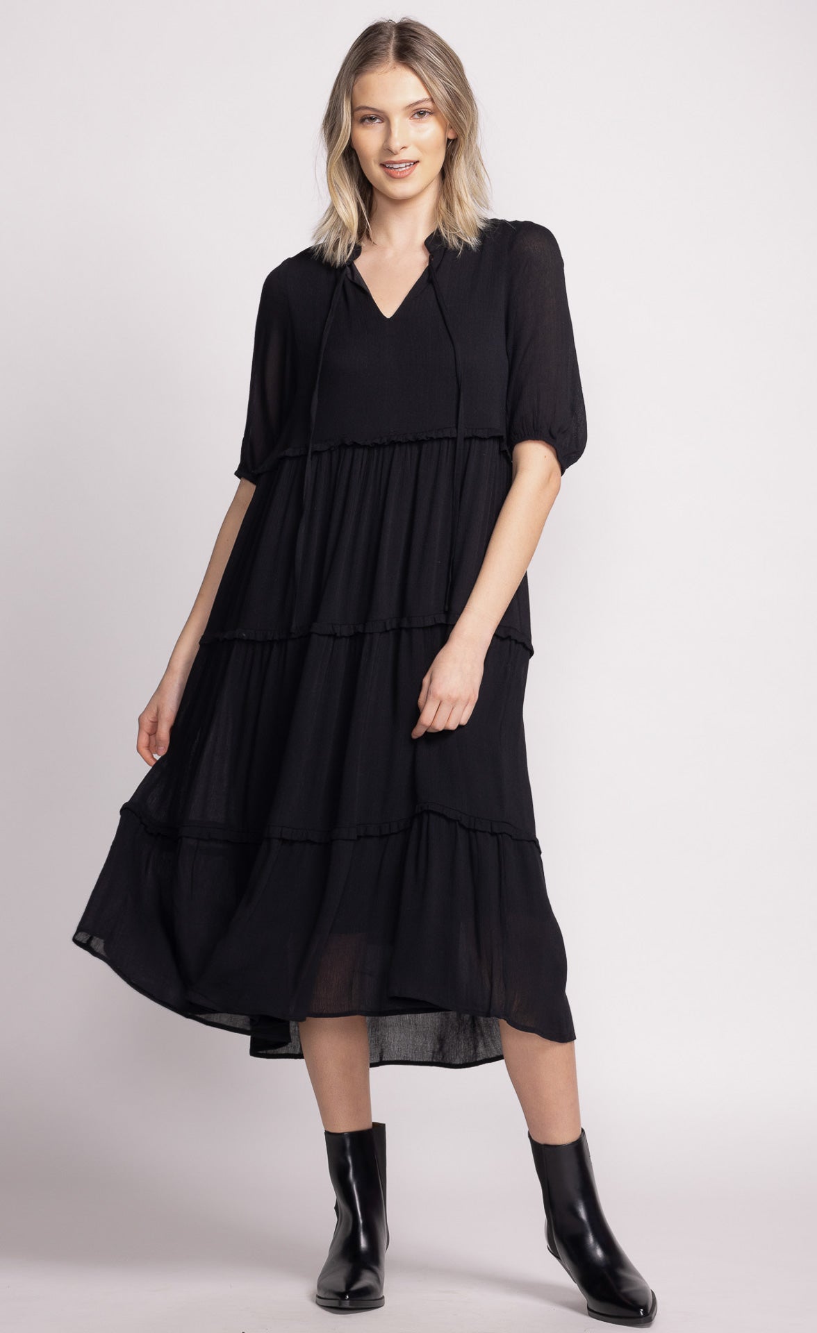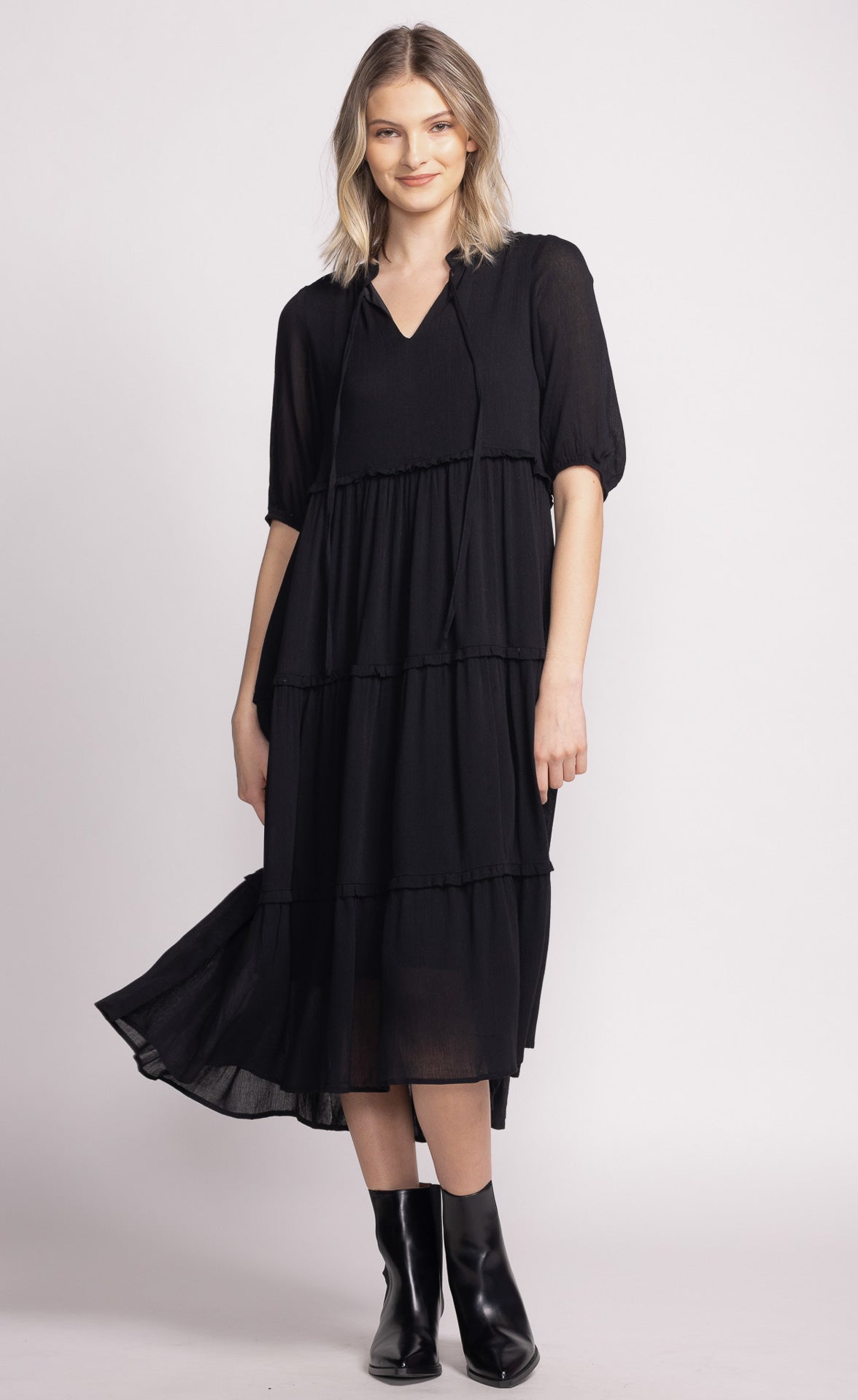 The Zoey Dress is a flowy mid with a fall-ready vibe, perfect for effortless style this season.