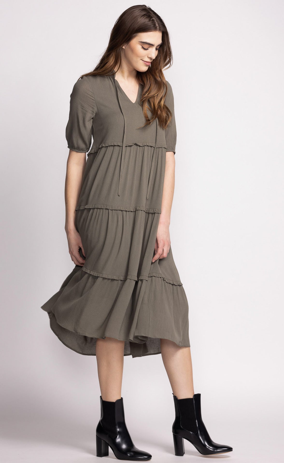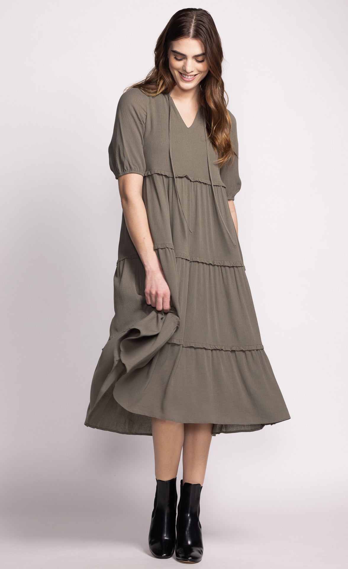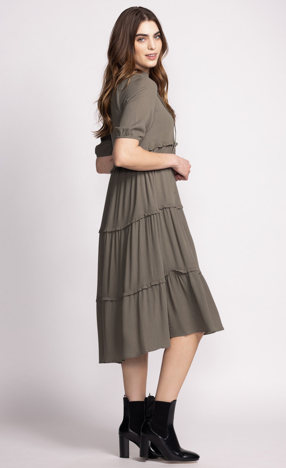 The Zoey Dress is a flowy mid with a fall-ready vibe, perfect for effortless style this season.