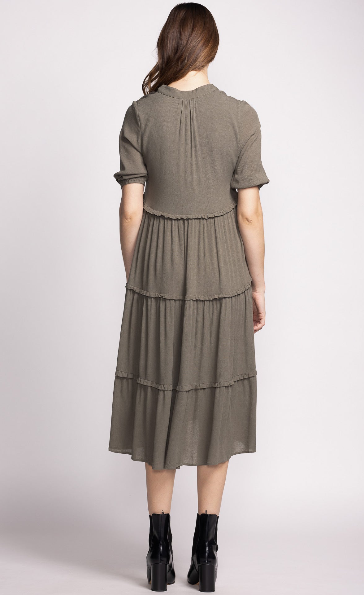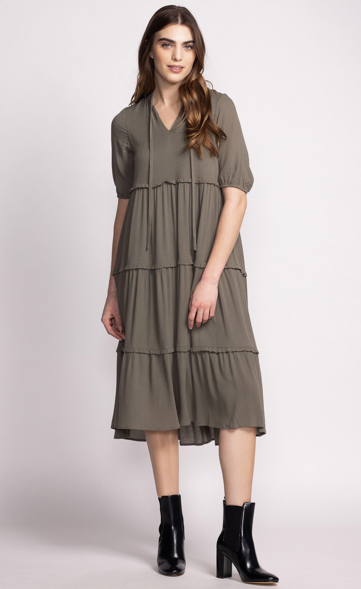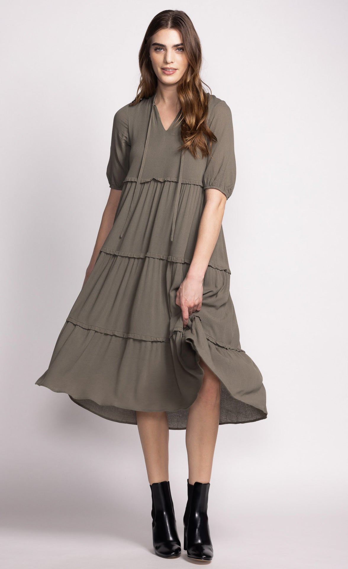 The Zoey Dress is a flowy mid with a fall-ready vibe, perfect for effortless style this season.