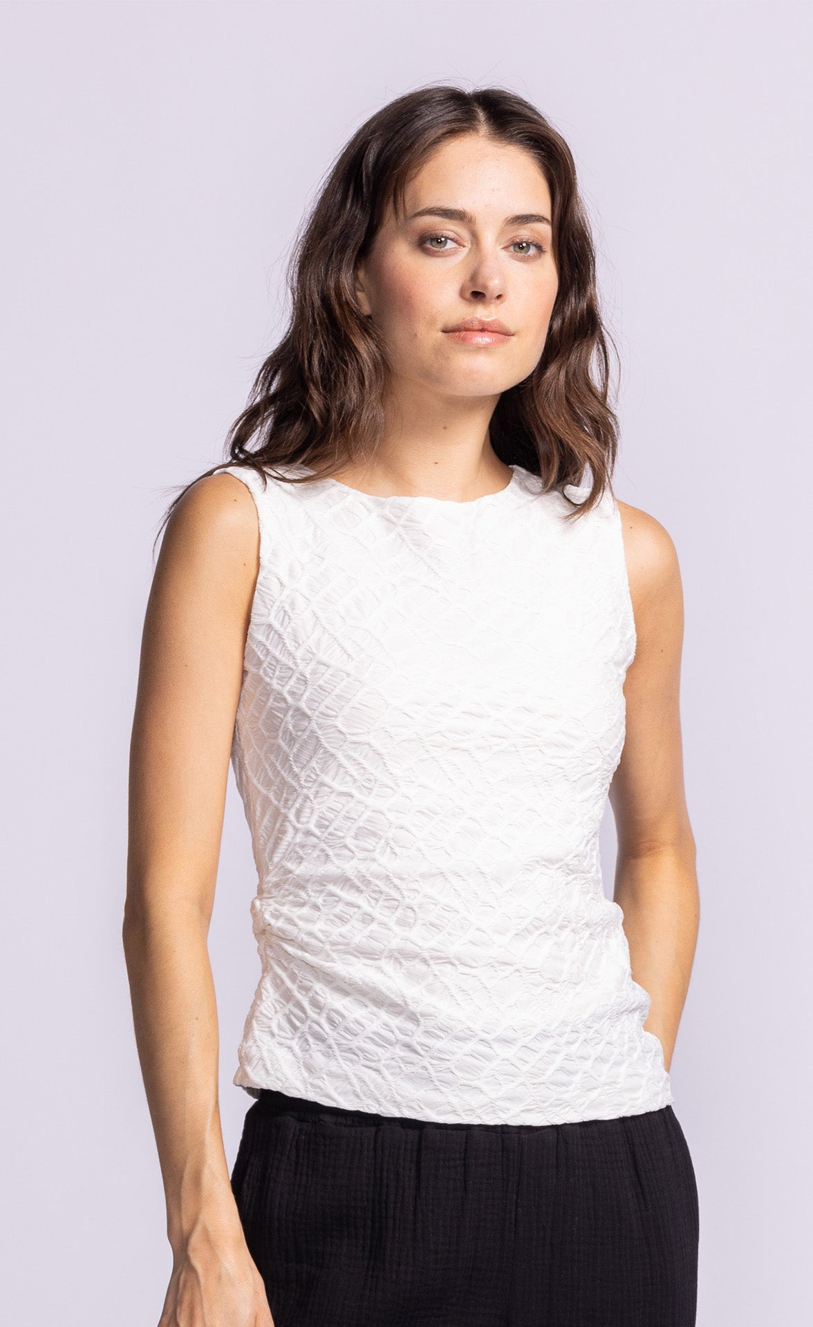 The Annika Top features a flattering, stretch-to-fit silhouette, made from textured fabric for a sleek and chic look—perfect for effortless styling!