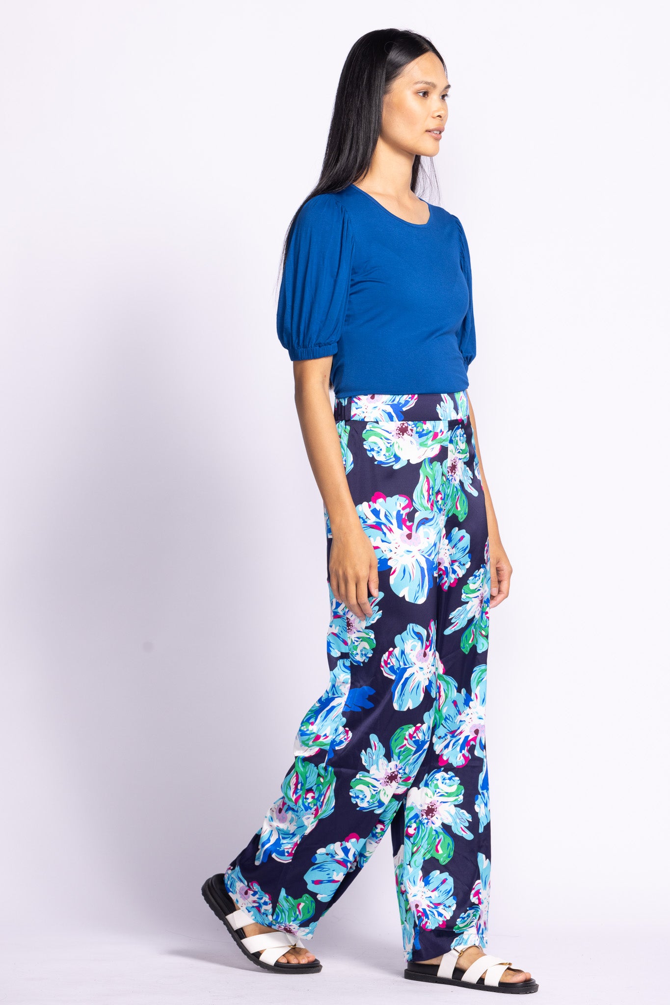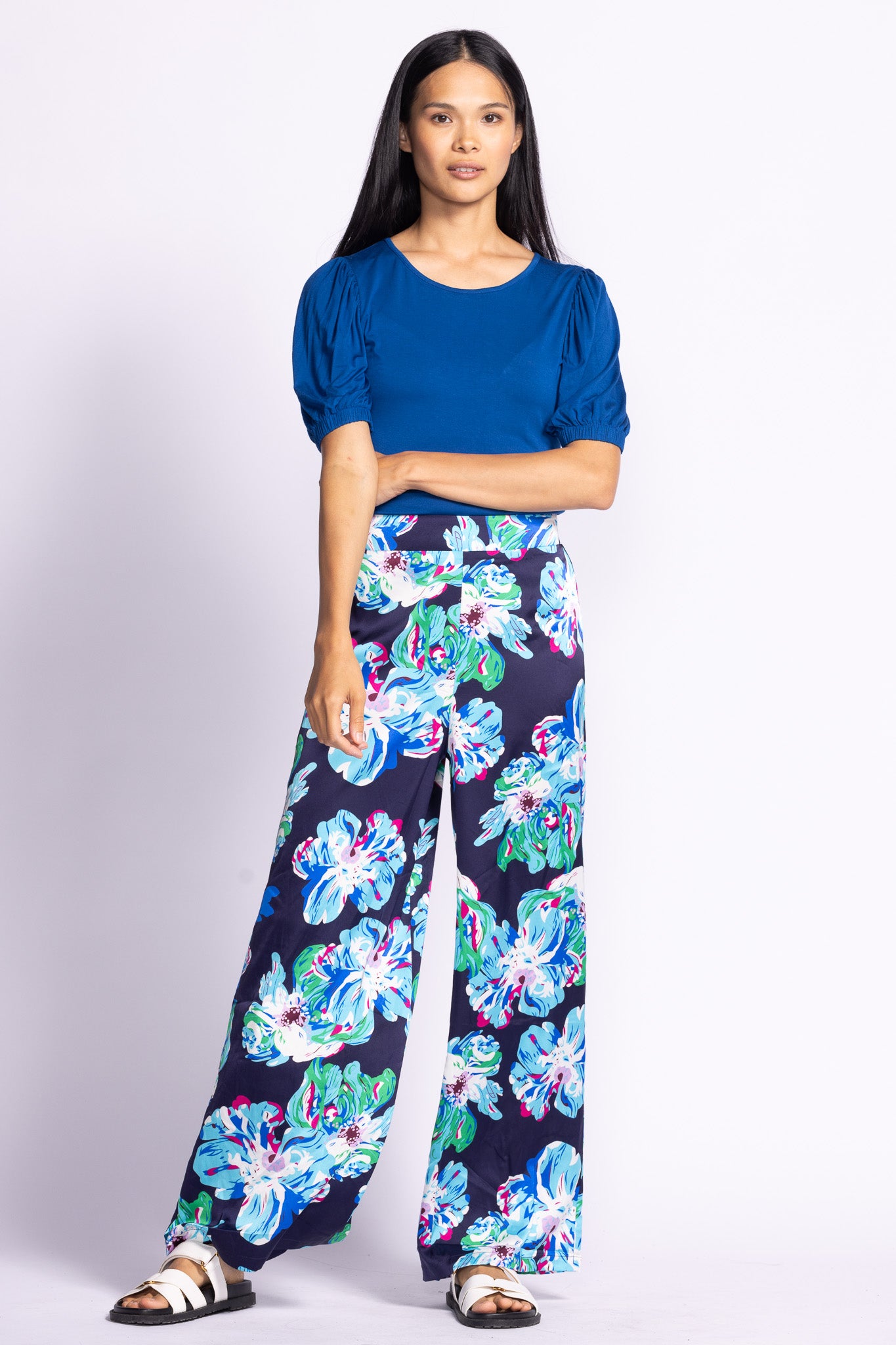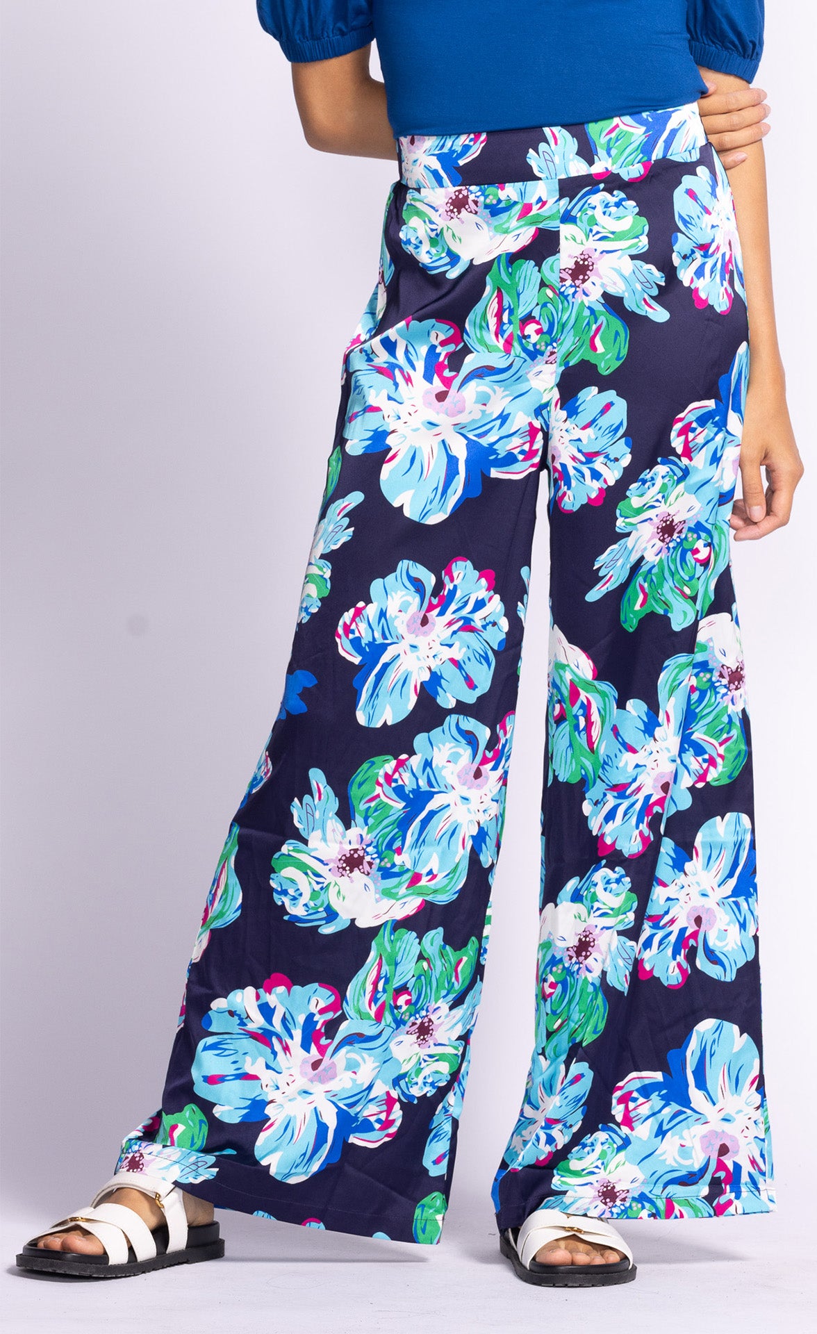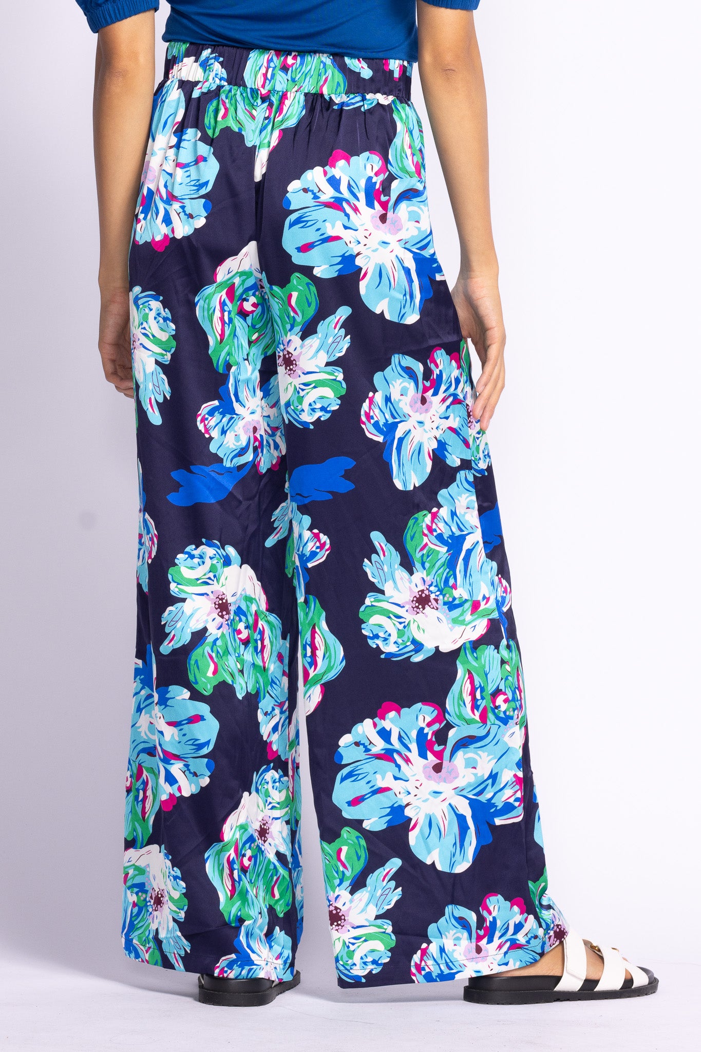 The Ariana Pants feature a flowing wide-leg flared silhouette and a gartered back waist for a comfortable fit. Made from a smooth, satin-like fabric adorned with a vibrant floral print, these pants are perfect for travel, resort wear, or everyday elevated looks.