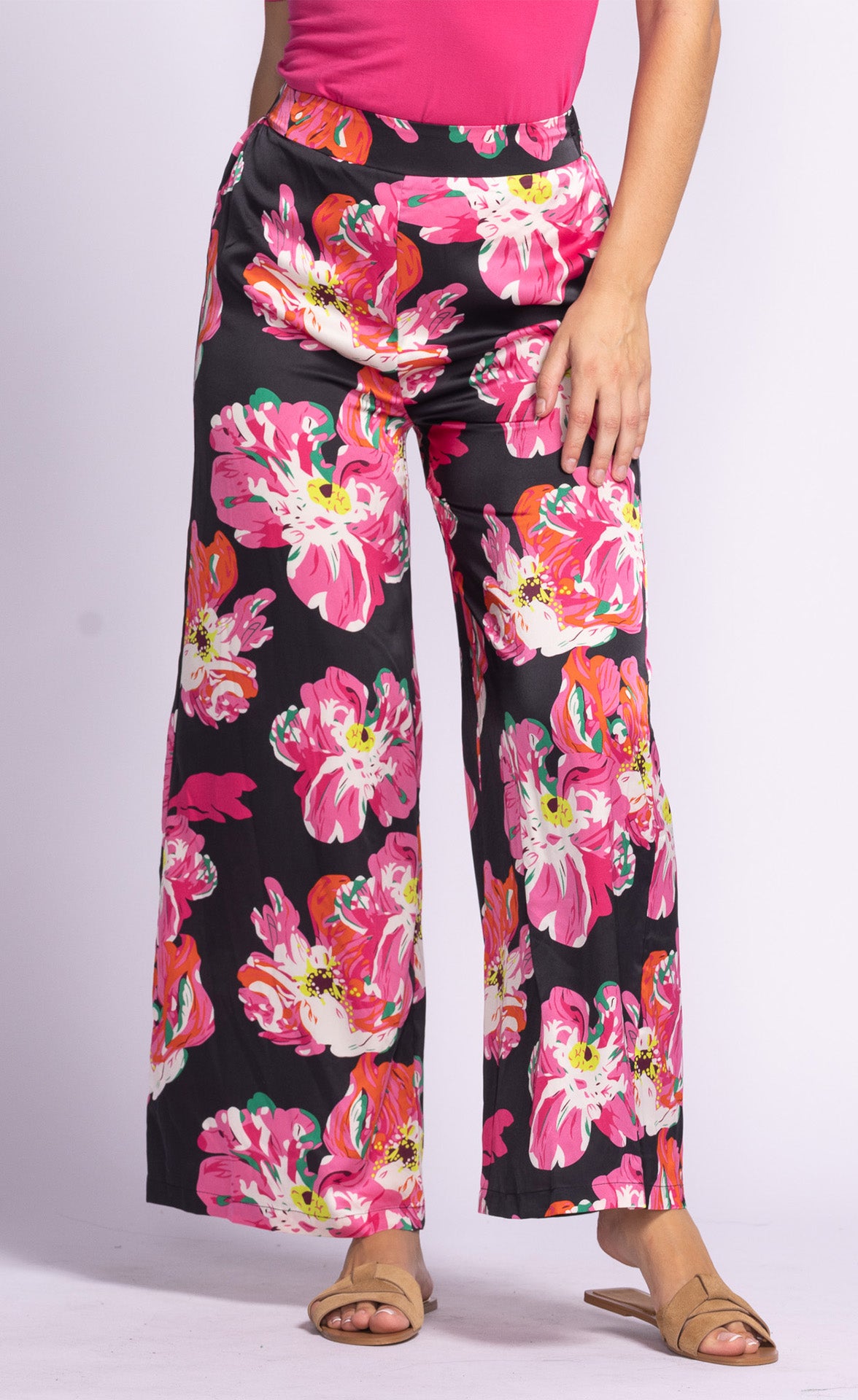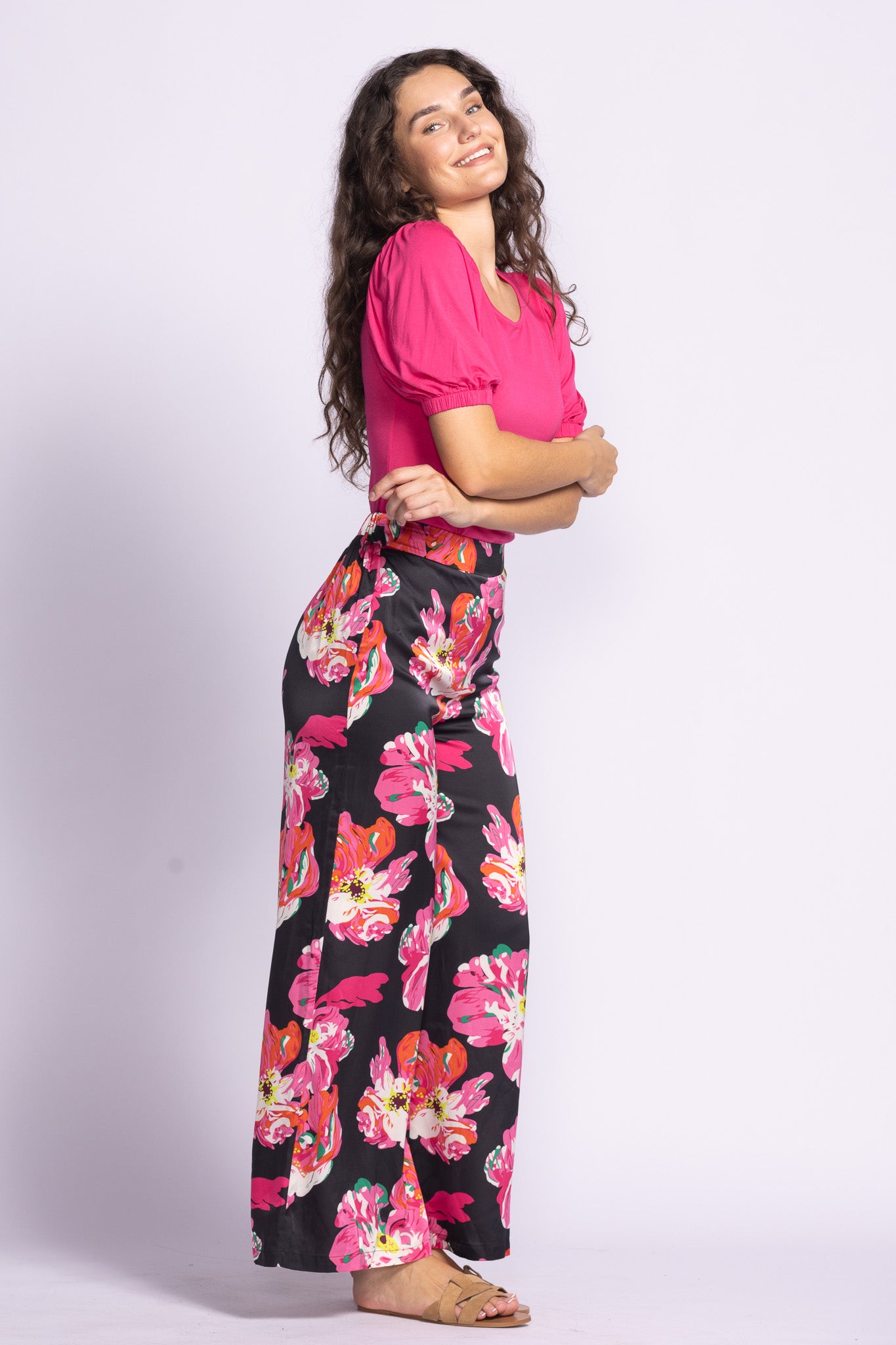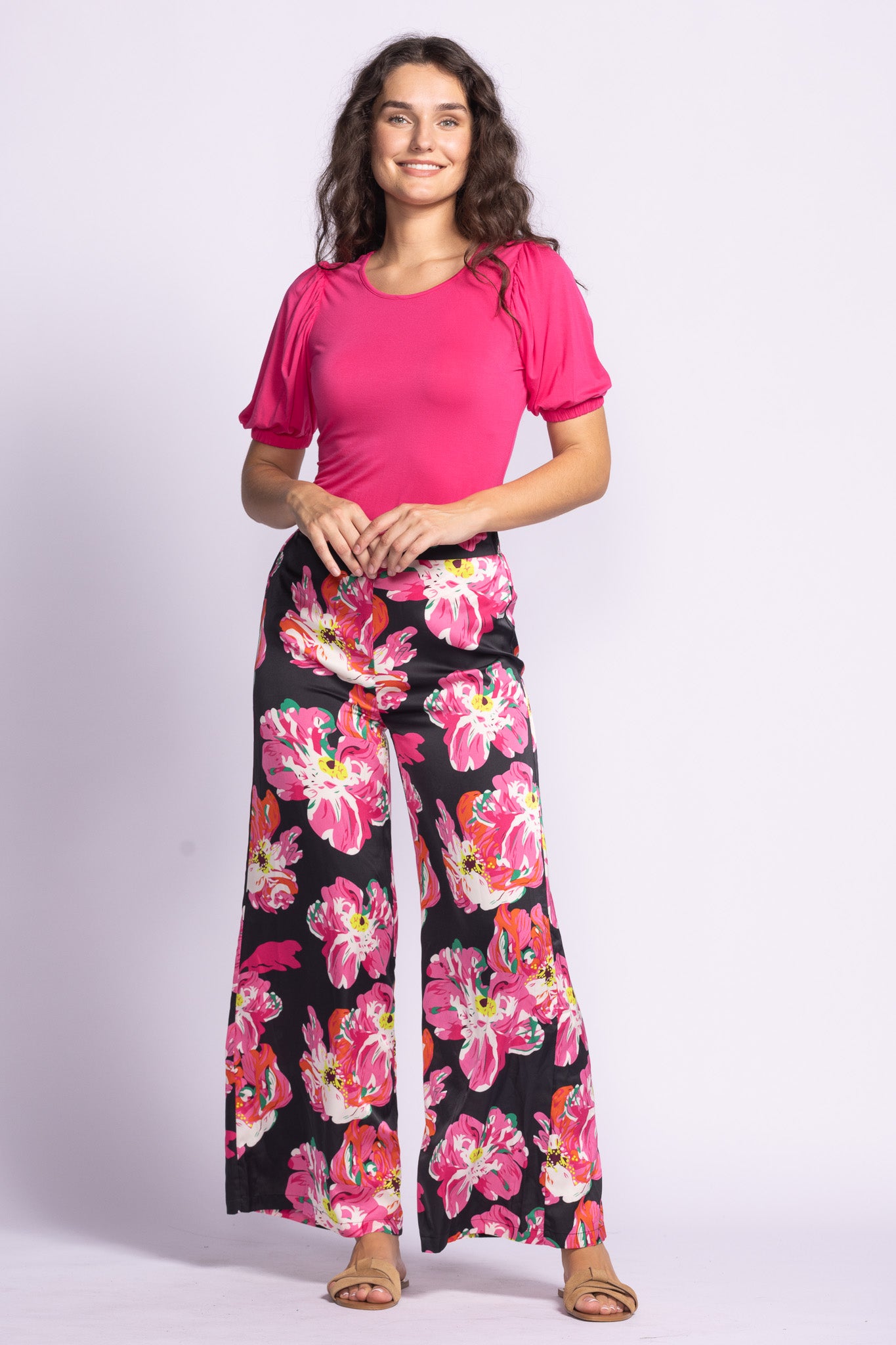 The Ariana Pants feature a flowing wide-leg flared silhouette and a gartered back waist for a comfortable fit. Made from a smooth, satin-like fabric adorned with a vibrant floral print, these pants are perfect for travel, resort wear, or everyday elevated looks.