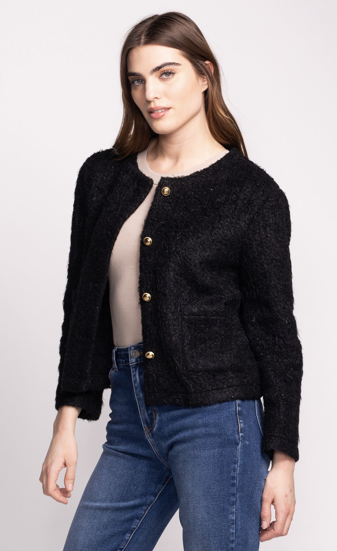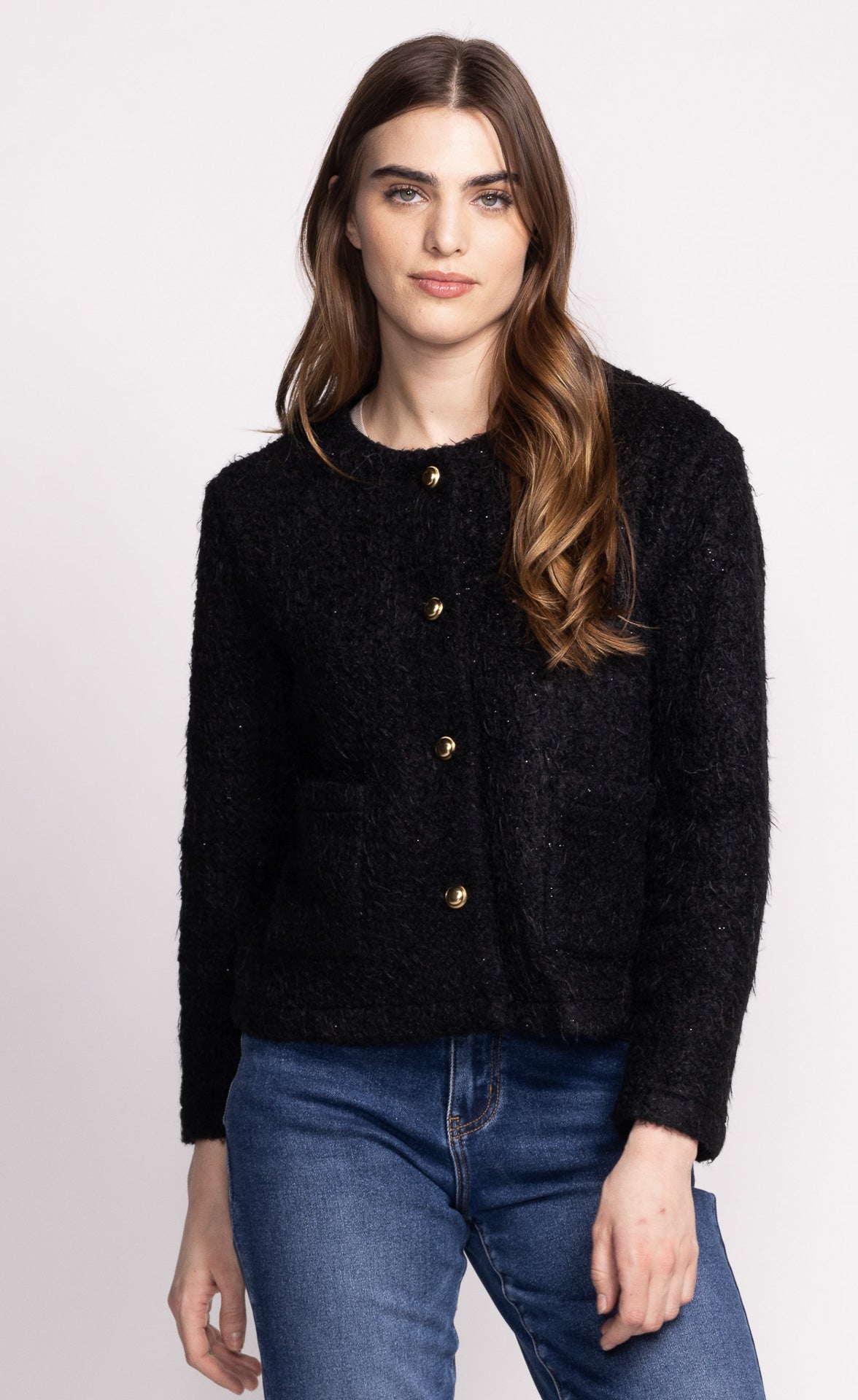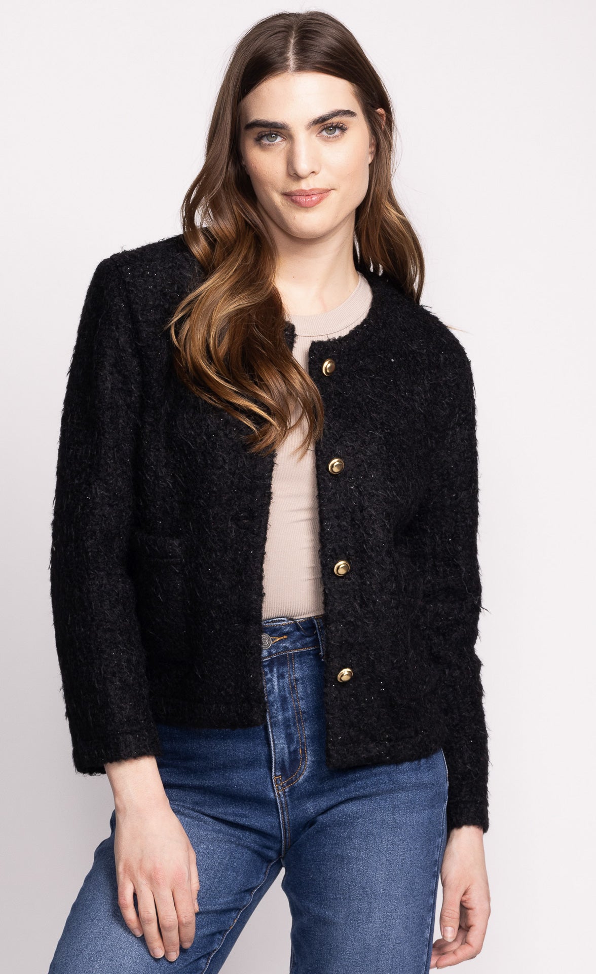 The Avalee Coat features a chic fuzzy fabric with elegant gold buttons, combining cozy comfort with timeless style.