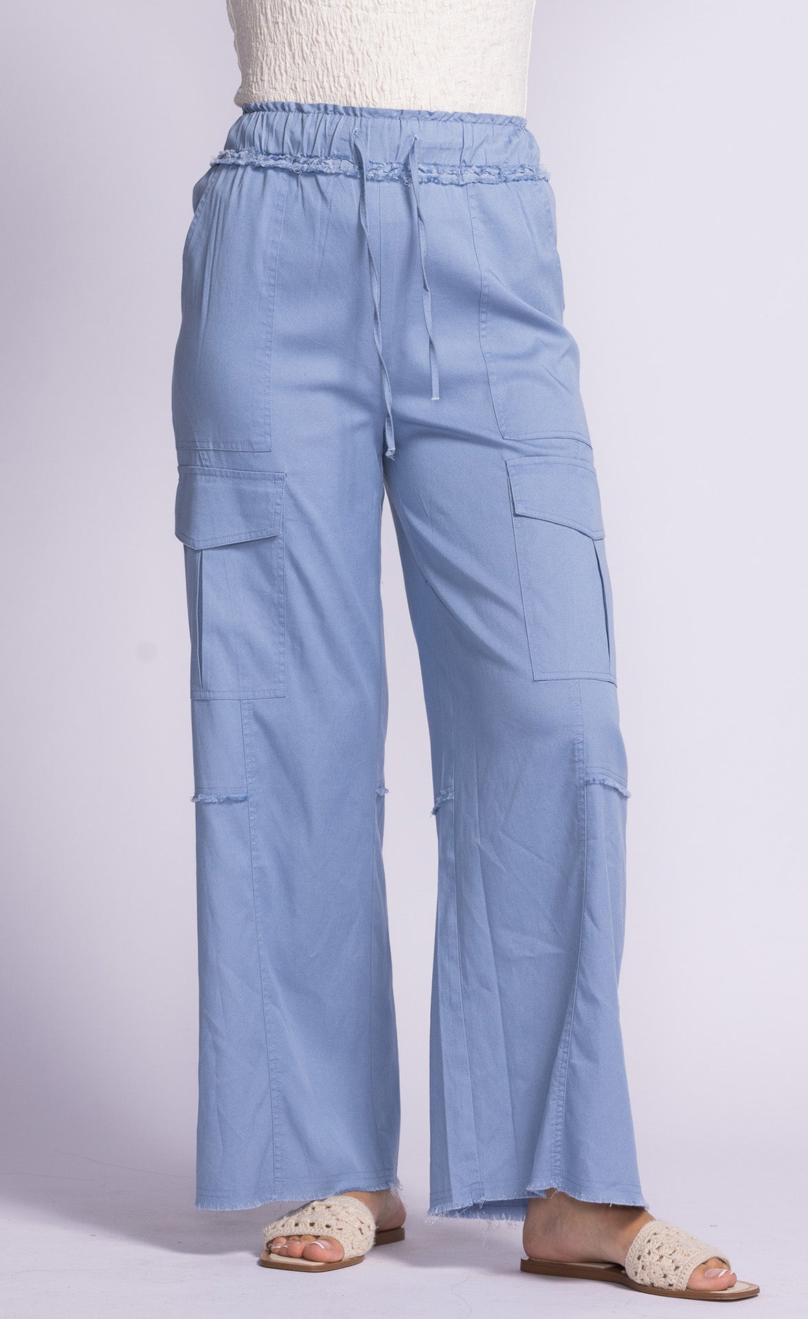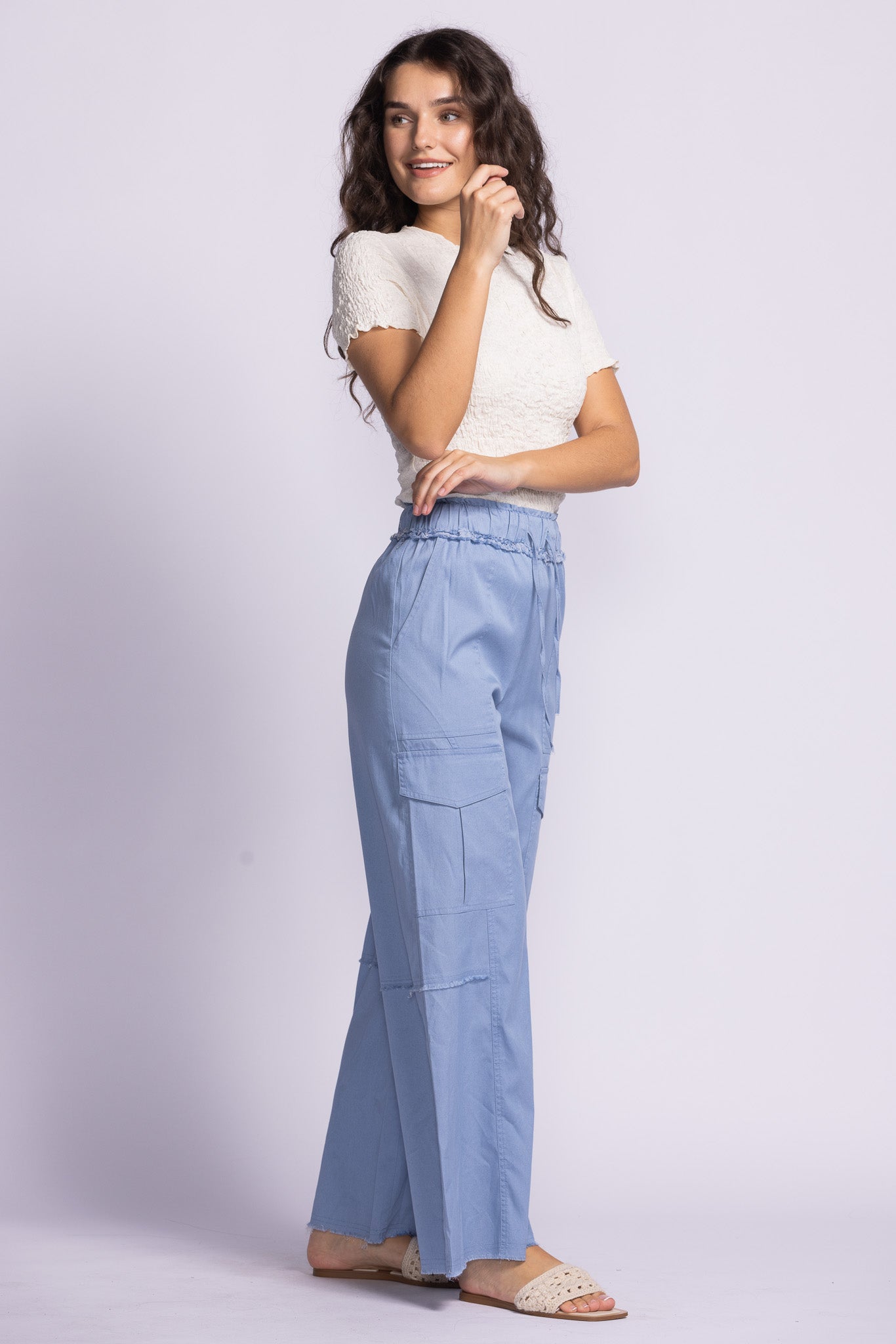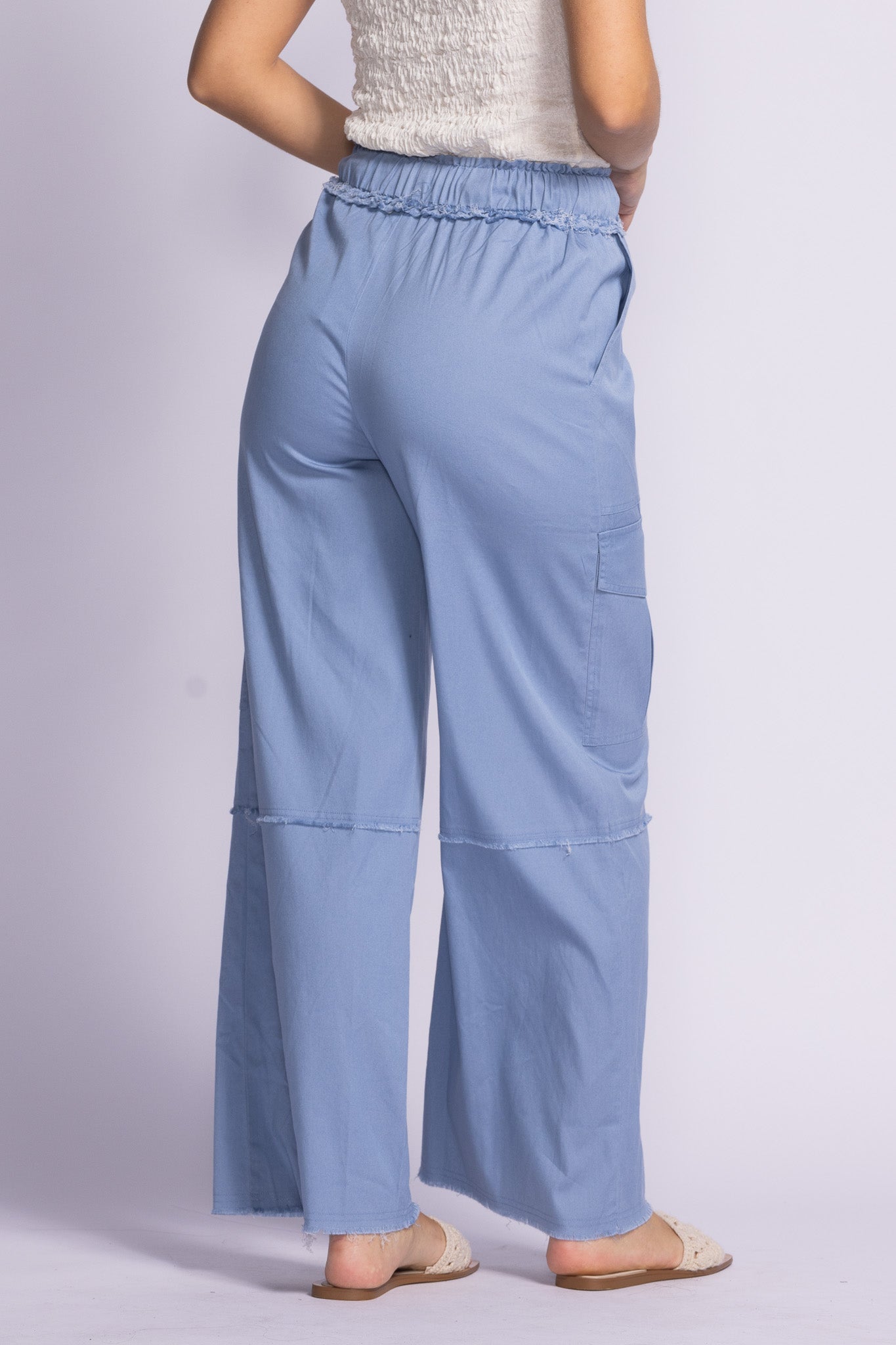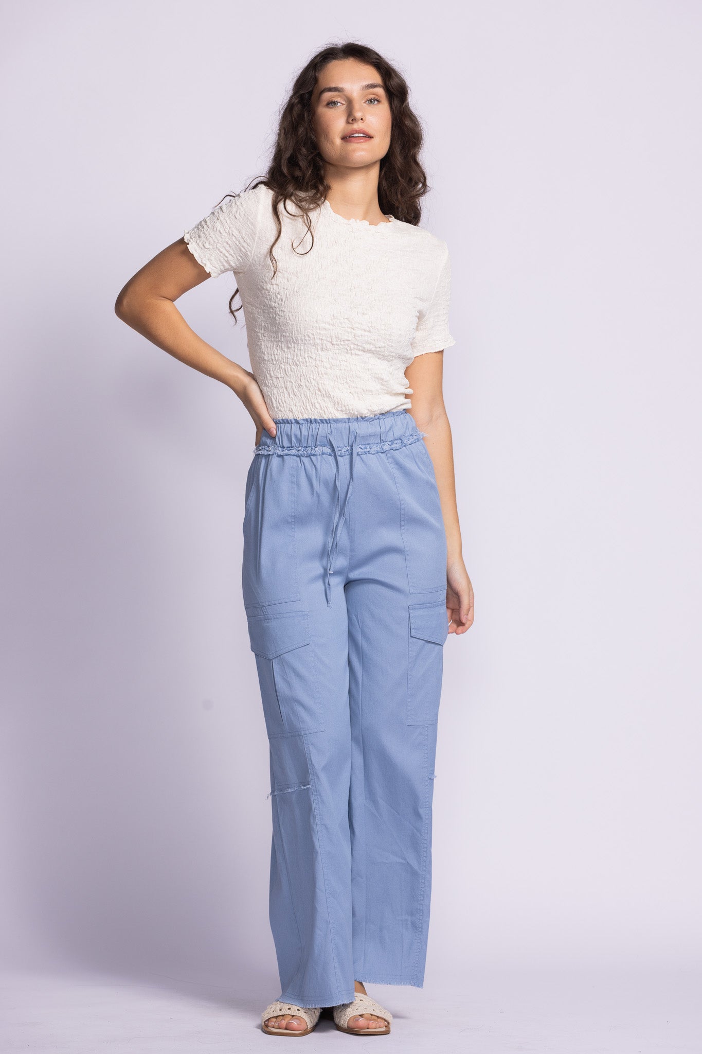 The Kristy Pants are wide-leg essentials with side pockets, an elastic waistband with cinchable drawcord waist, and a semi-distressed hem. Chic and versatile, they look perfect paired with a crisp white top.