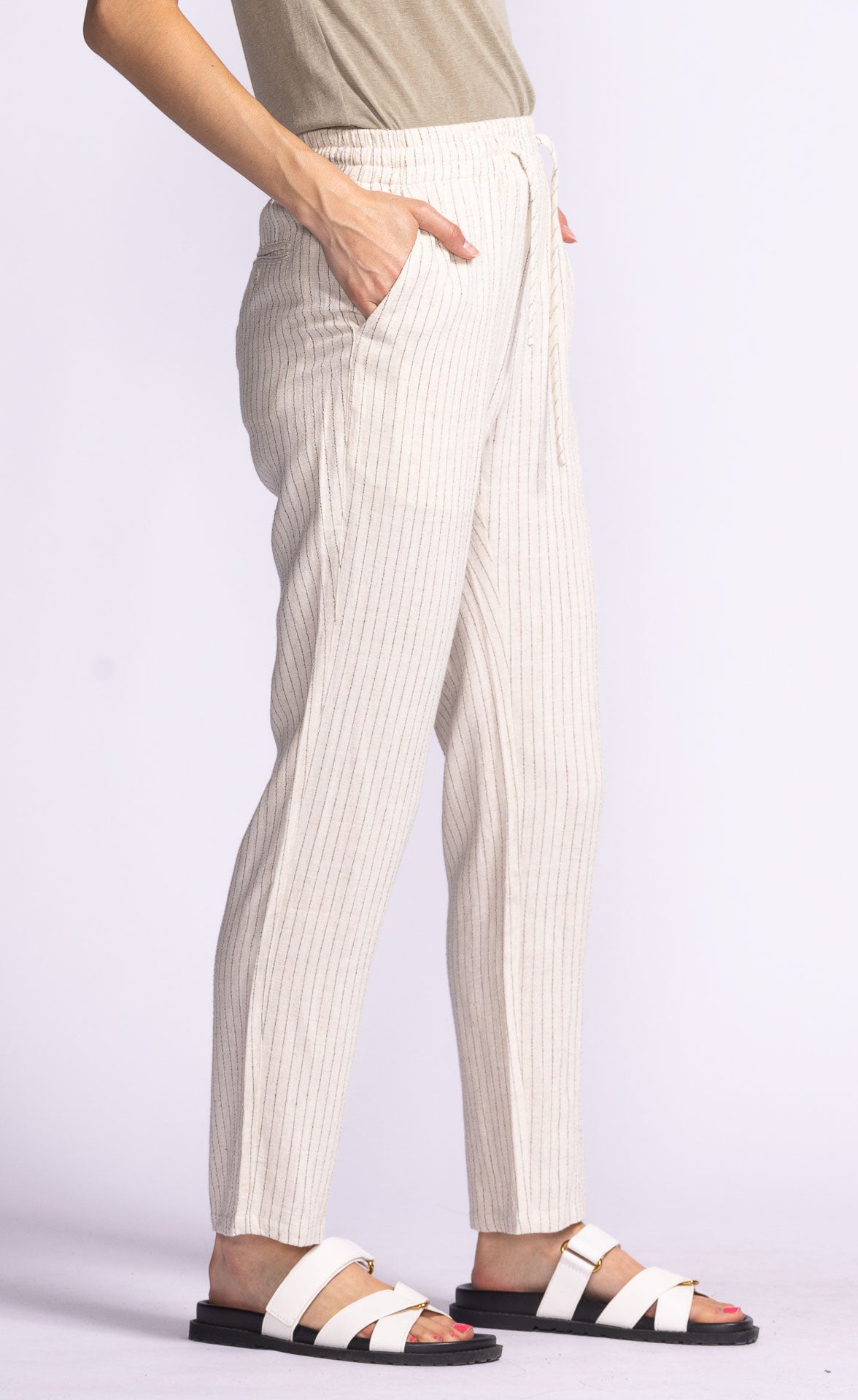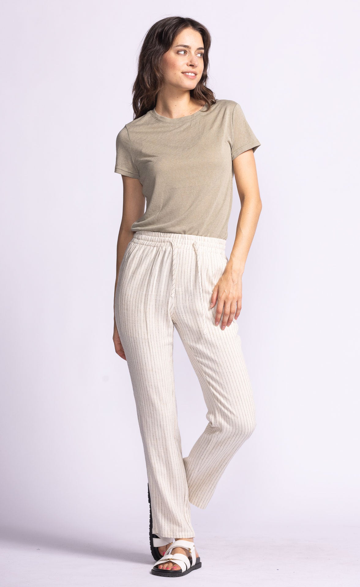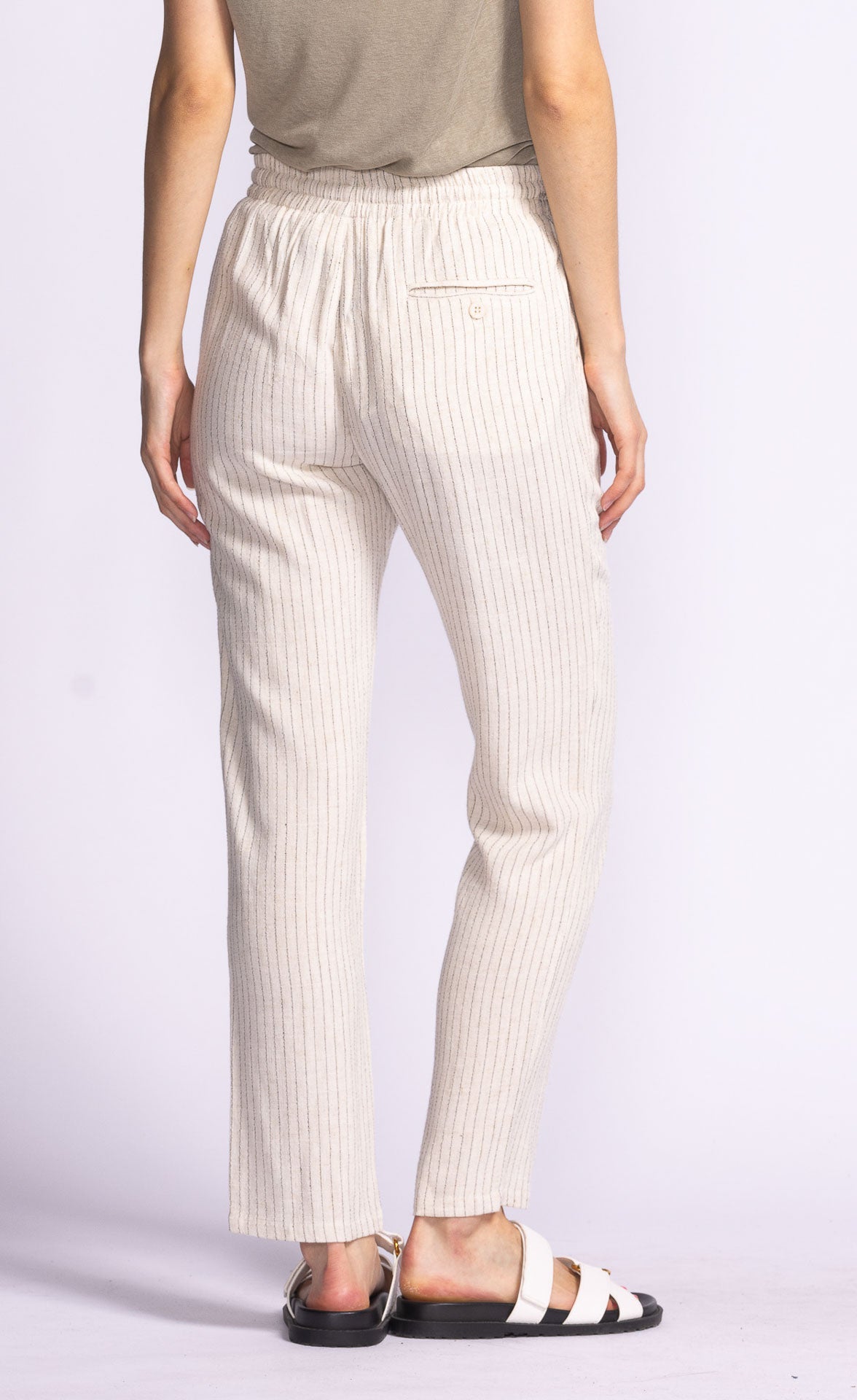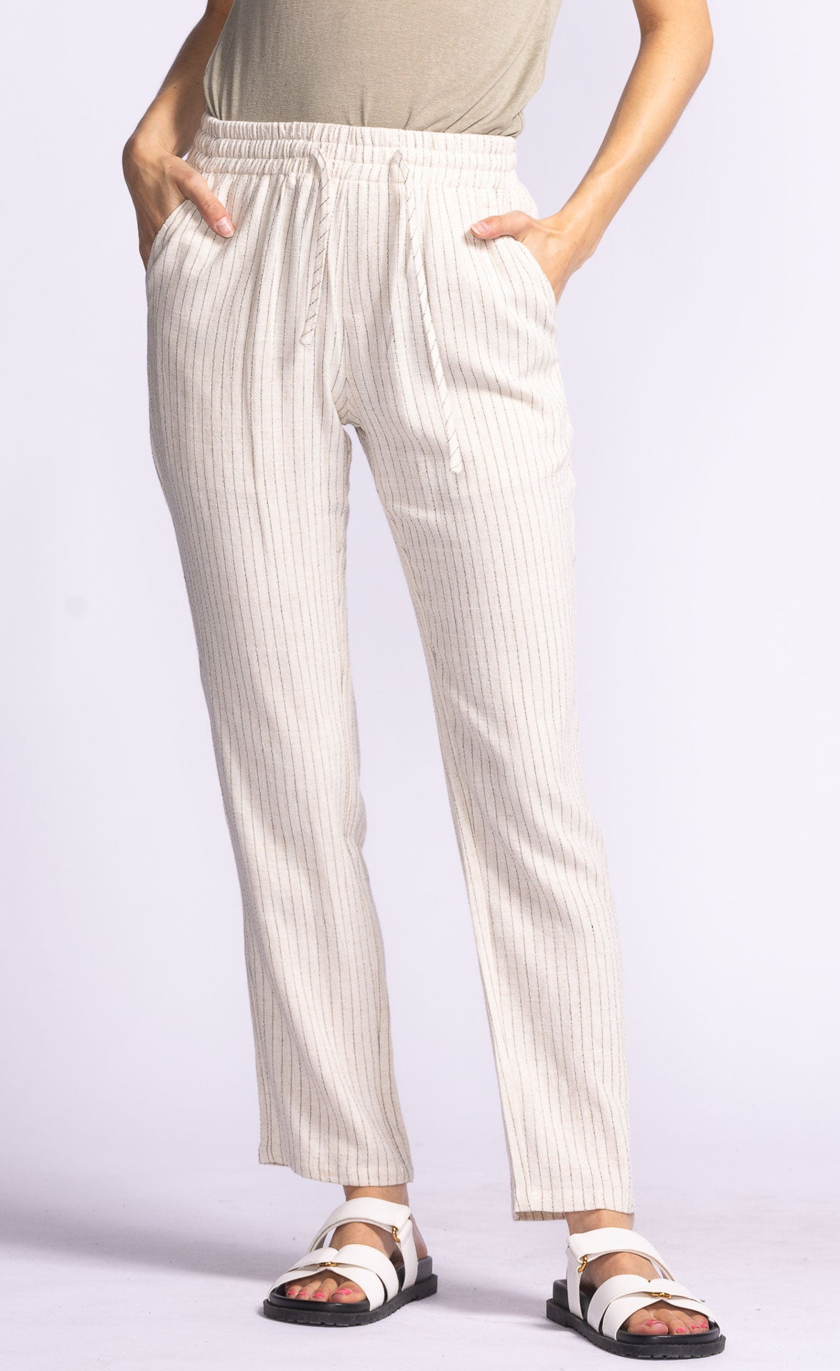The Lacey Pants feature a straight-leg fit, elastic waistband, and cinchable drawcord waist with a subtle stripe print. Style them with a tucked-in tee or a cropped top for an effortlessly chic look.