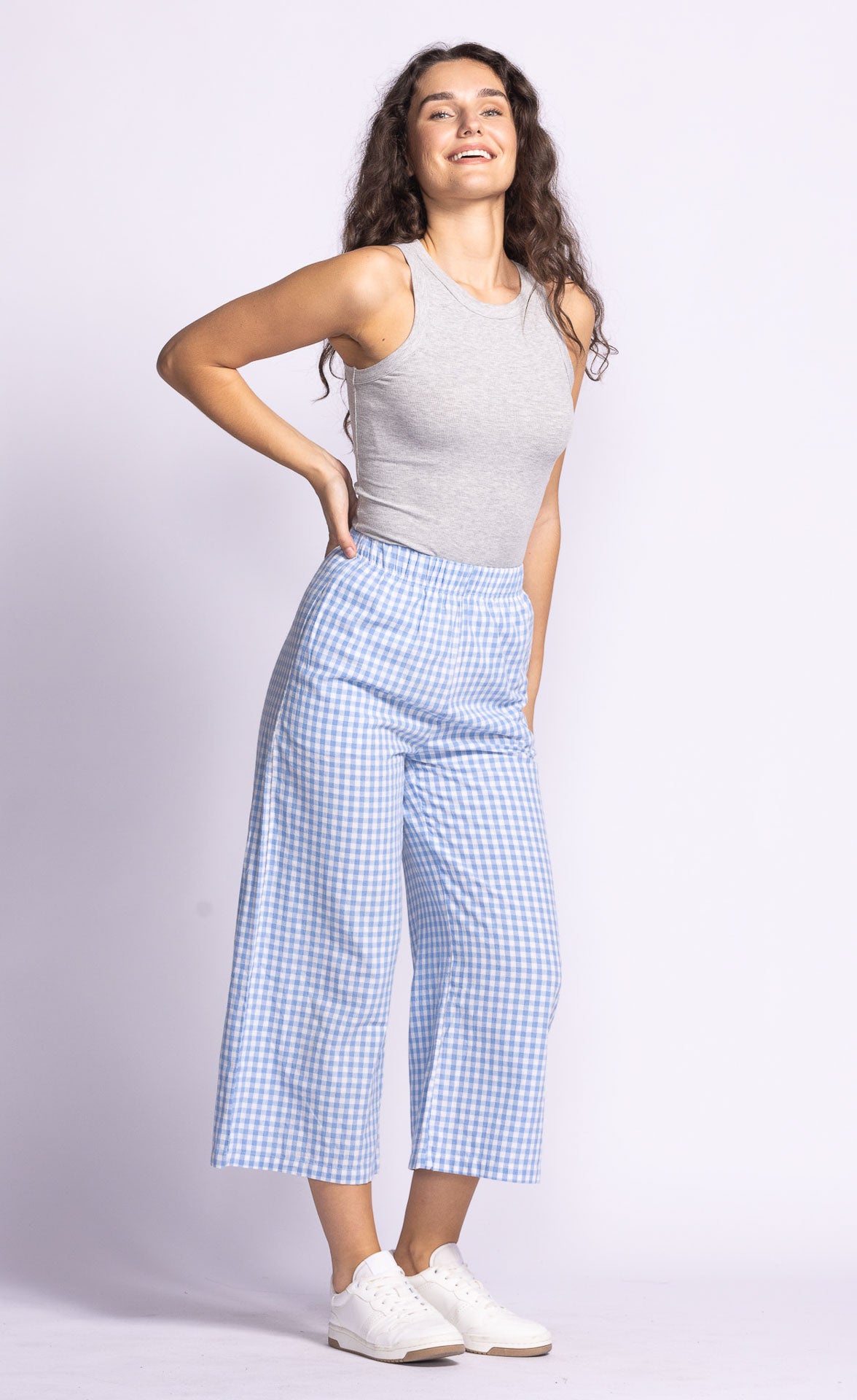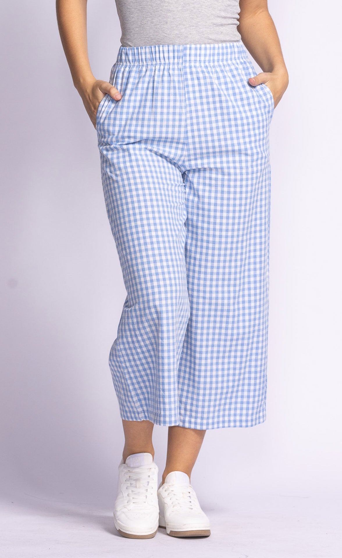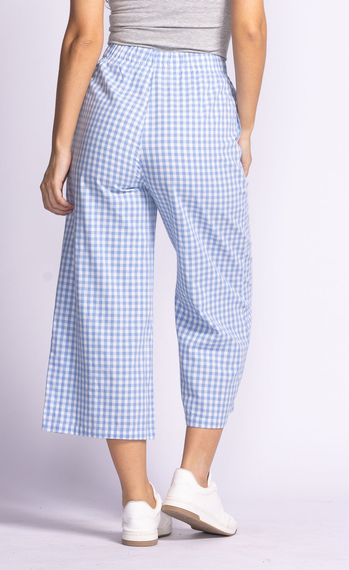 The Miranda Pants feature a comfortable elastic waistband and a relaxed fit, adorned with a charming gingham print—perfect for a laid-back, stylish vibe!