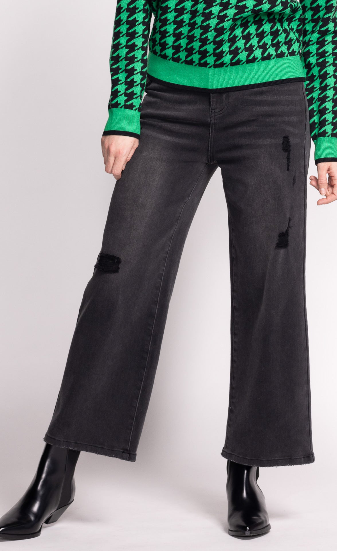 The Rory Denim features a subtle flare wide-leg silhouette with delicate distress details for a cool, modern look. Pair it with a cropped sweater and platform sneakers for a trendy, relaxed style.