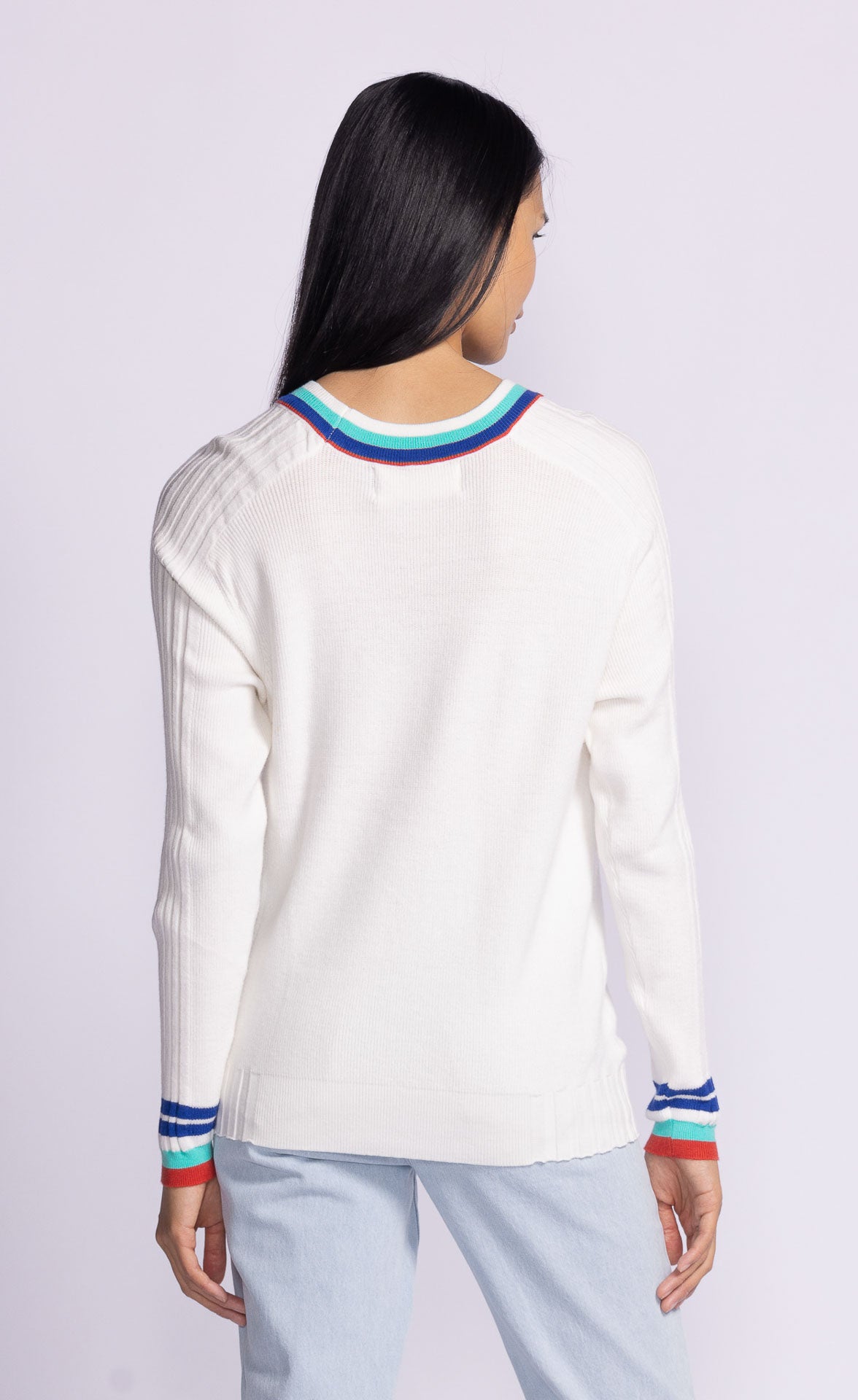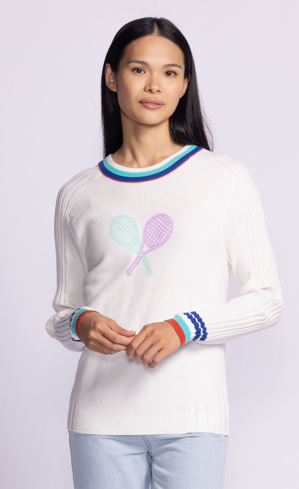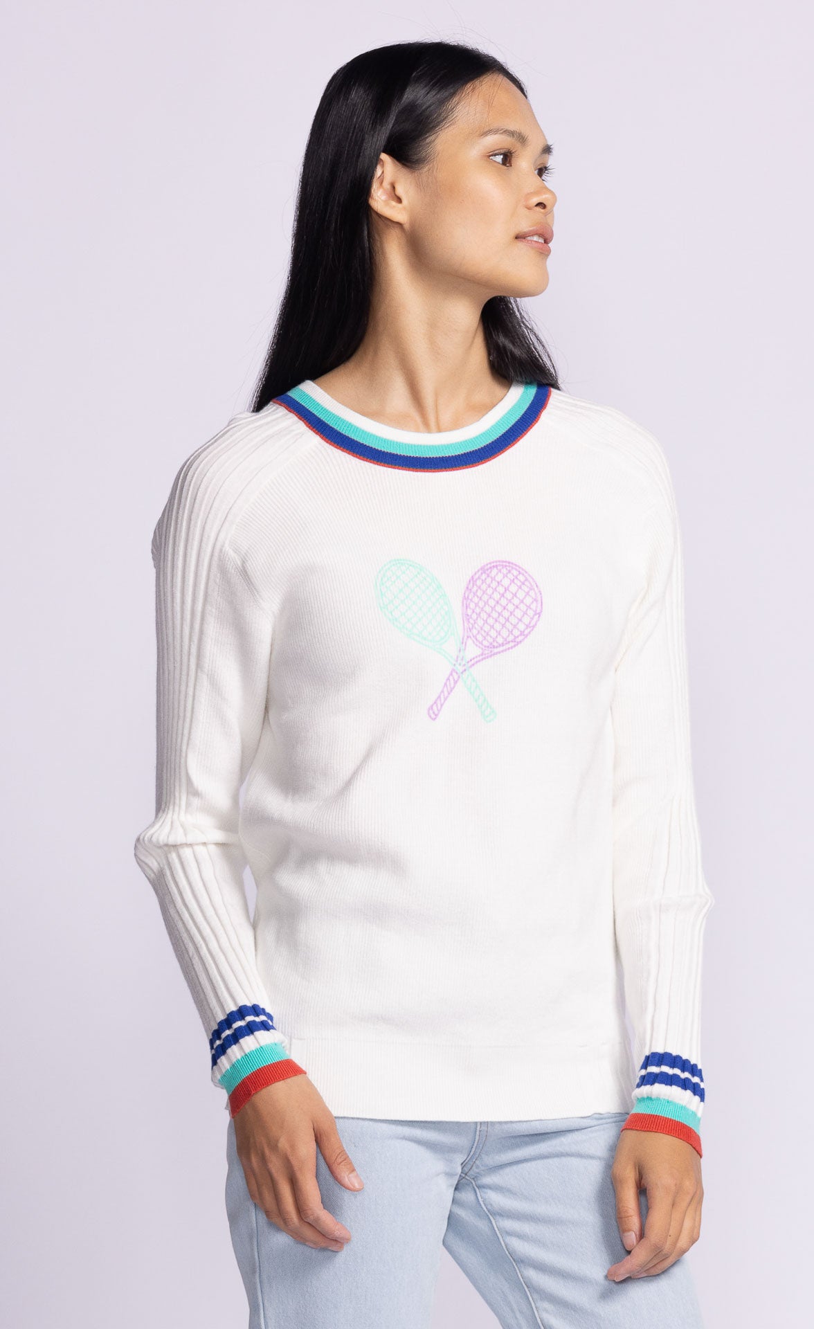 The Tessa Sweater combines sporty charm with style, featuring a tennis print on the front, color block ribbed neck and cuffs, raglan sleeves, and ribbed shoulder details. Pair it with pleated skirts or joggers for an effortlessly chic look!