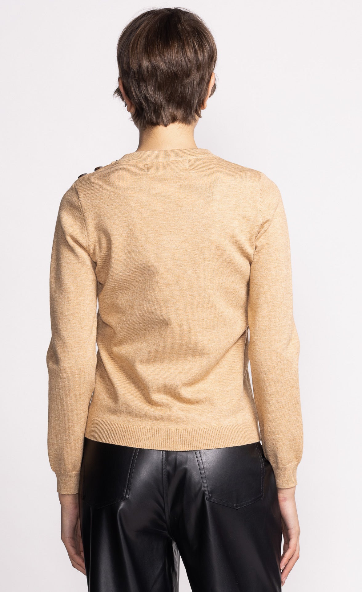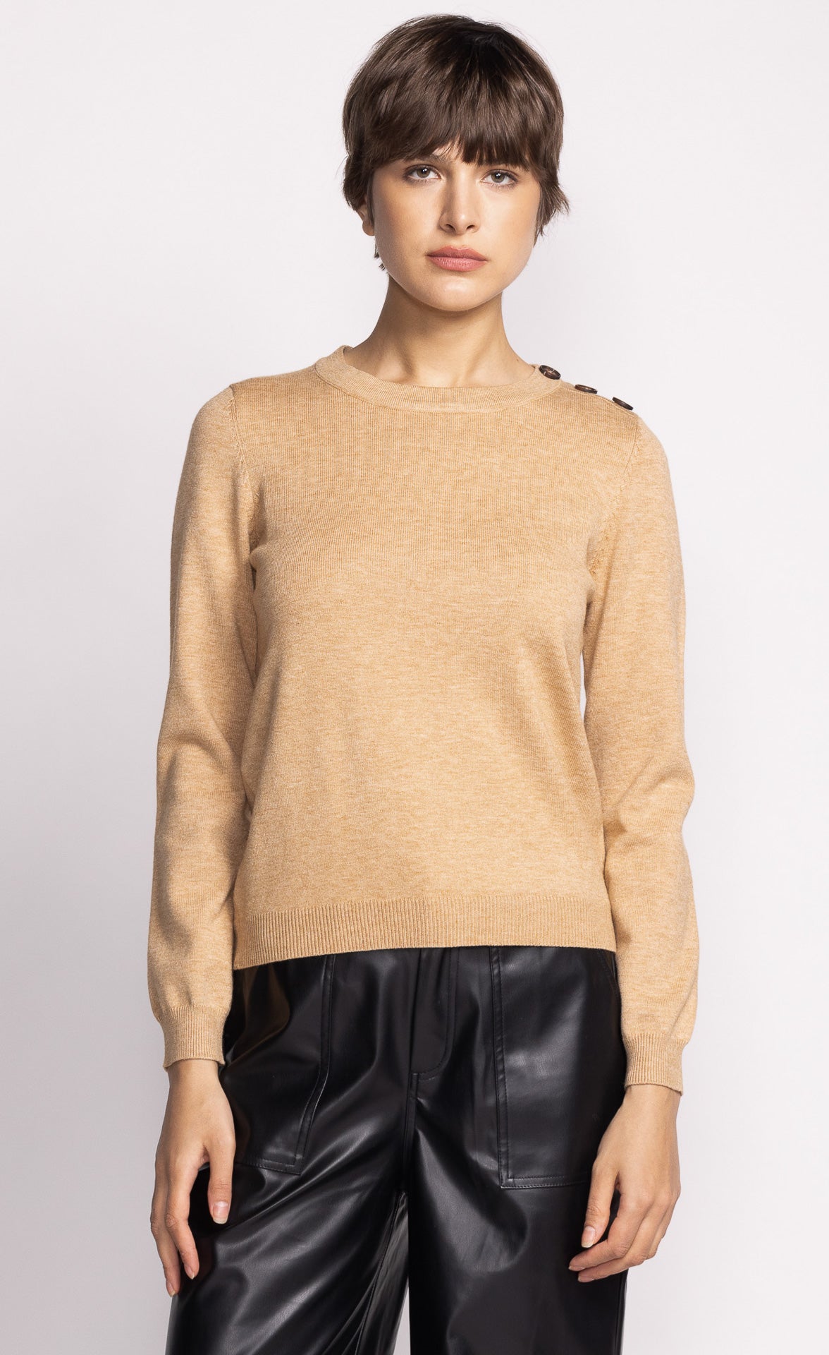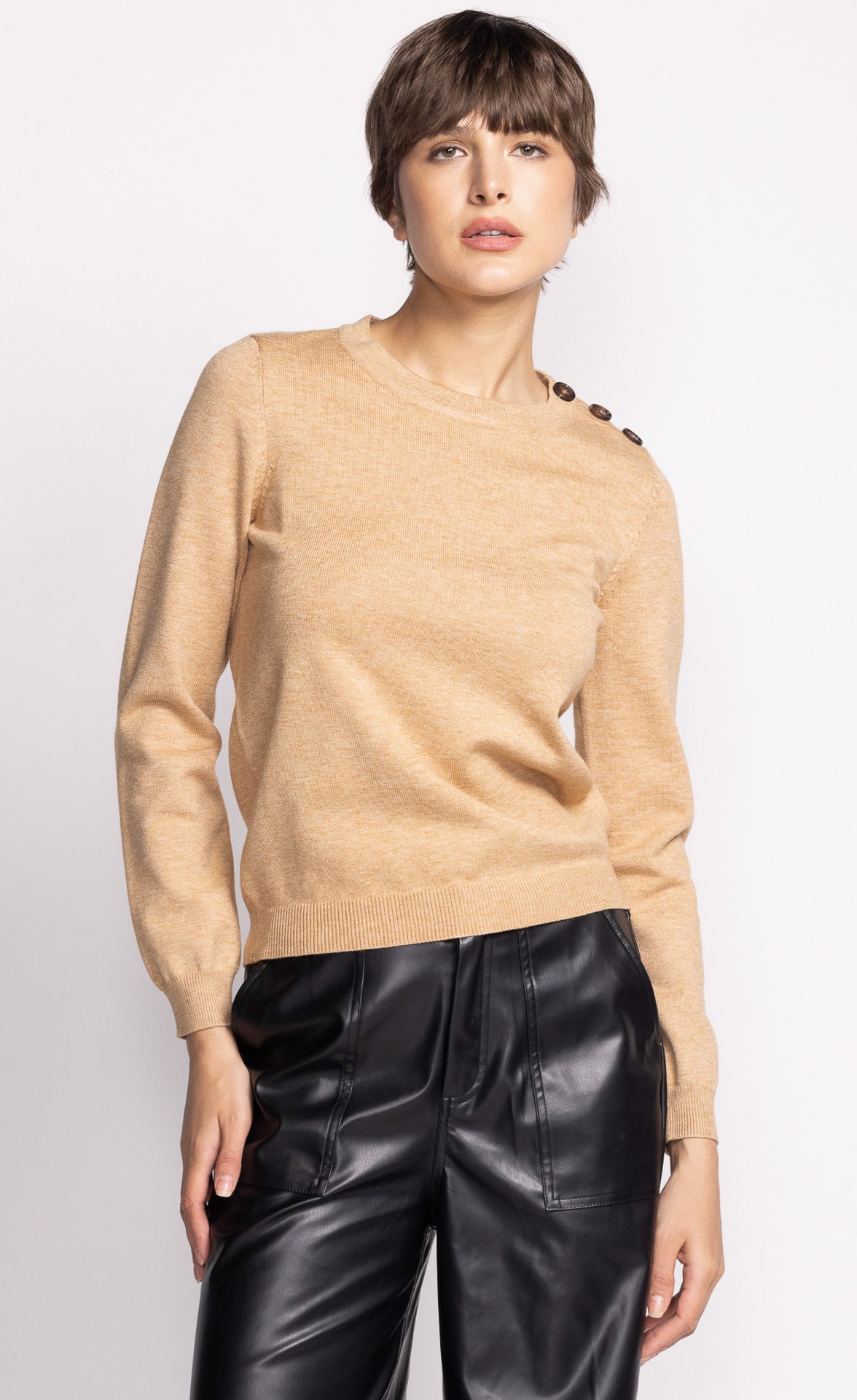 The Brandi Sweater boasts elegant button details on the shoulder, with ribbed hem and cuffs for a refined touch. Style it with tailored trousers or a midi skirt for a polished, everyday look!